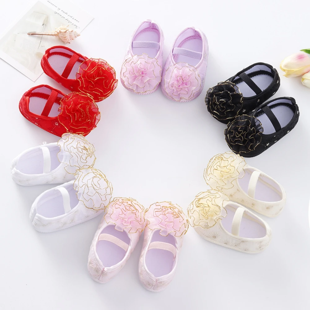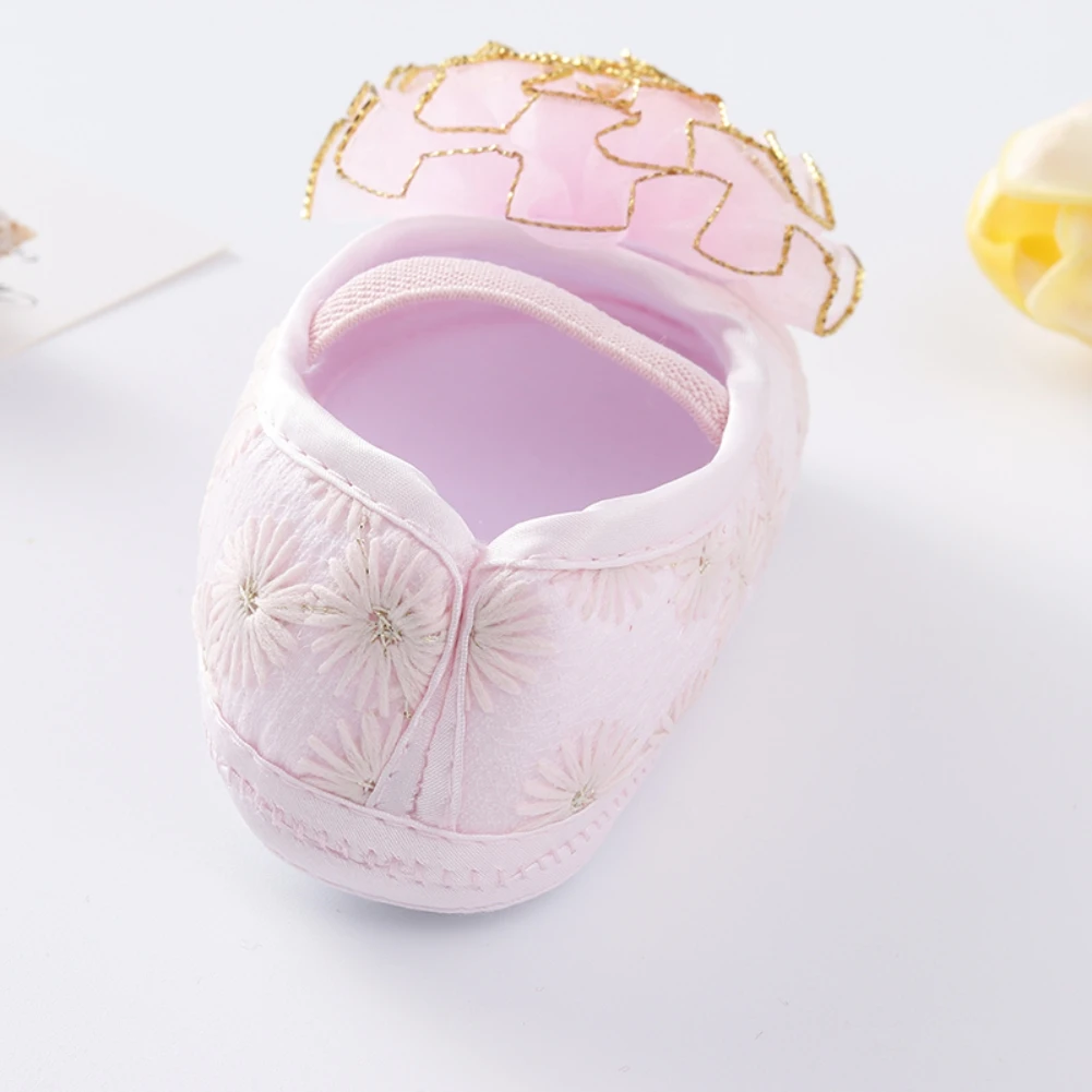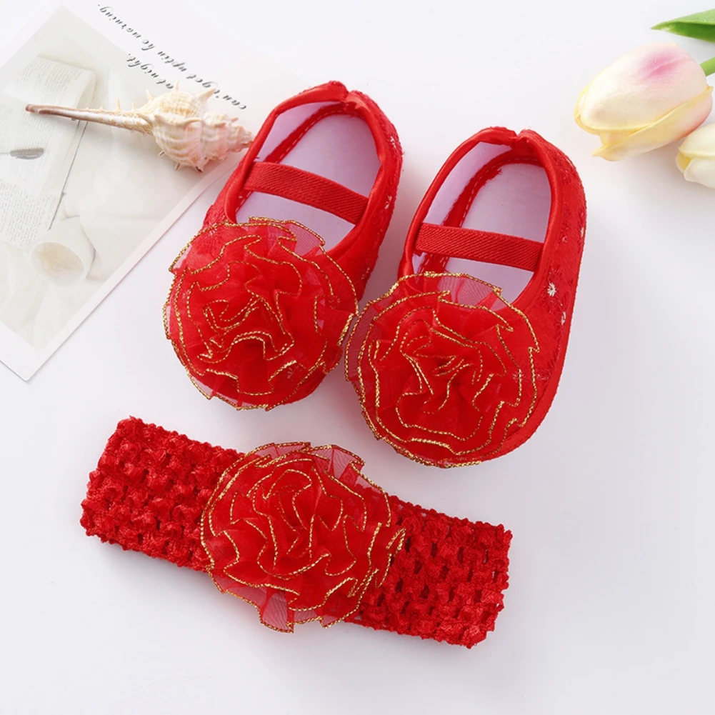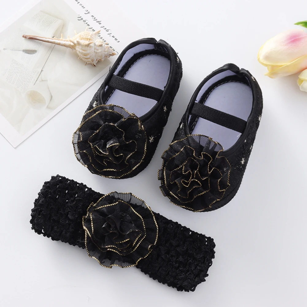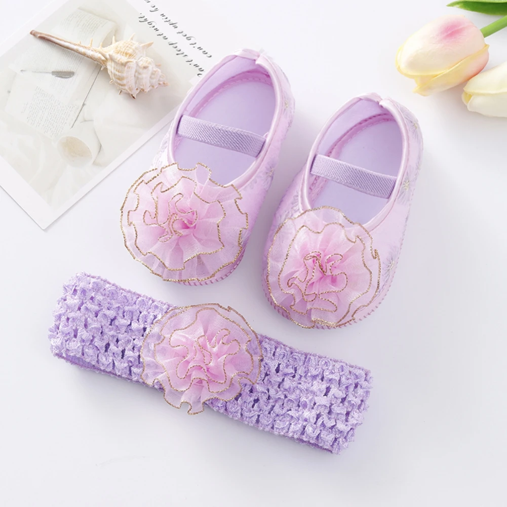 Пинетки для маленьких девочек + повязка на голову, модная милая мягкая обувь с цветами для малышей, детские пинетки с цветами, повседневная обувь принцессы