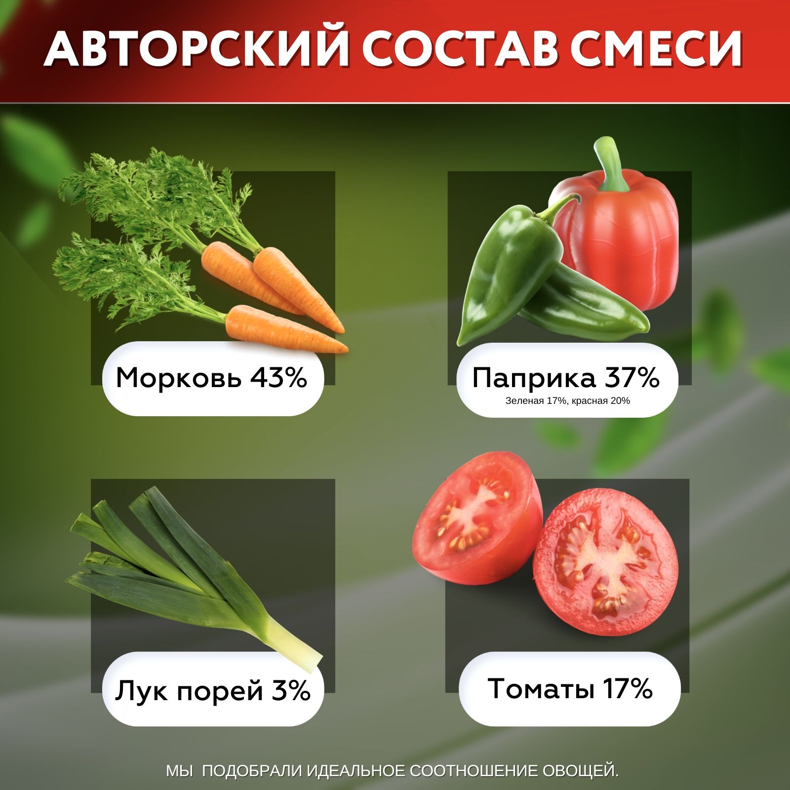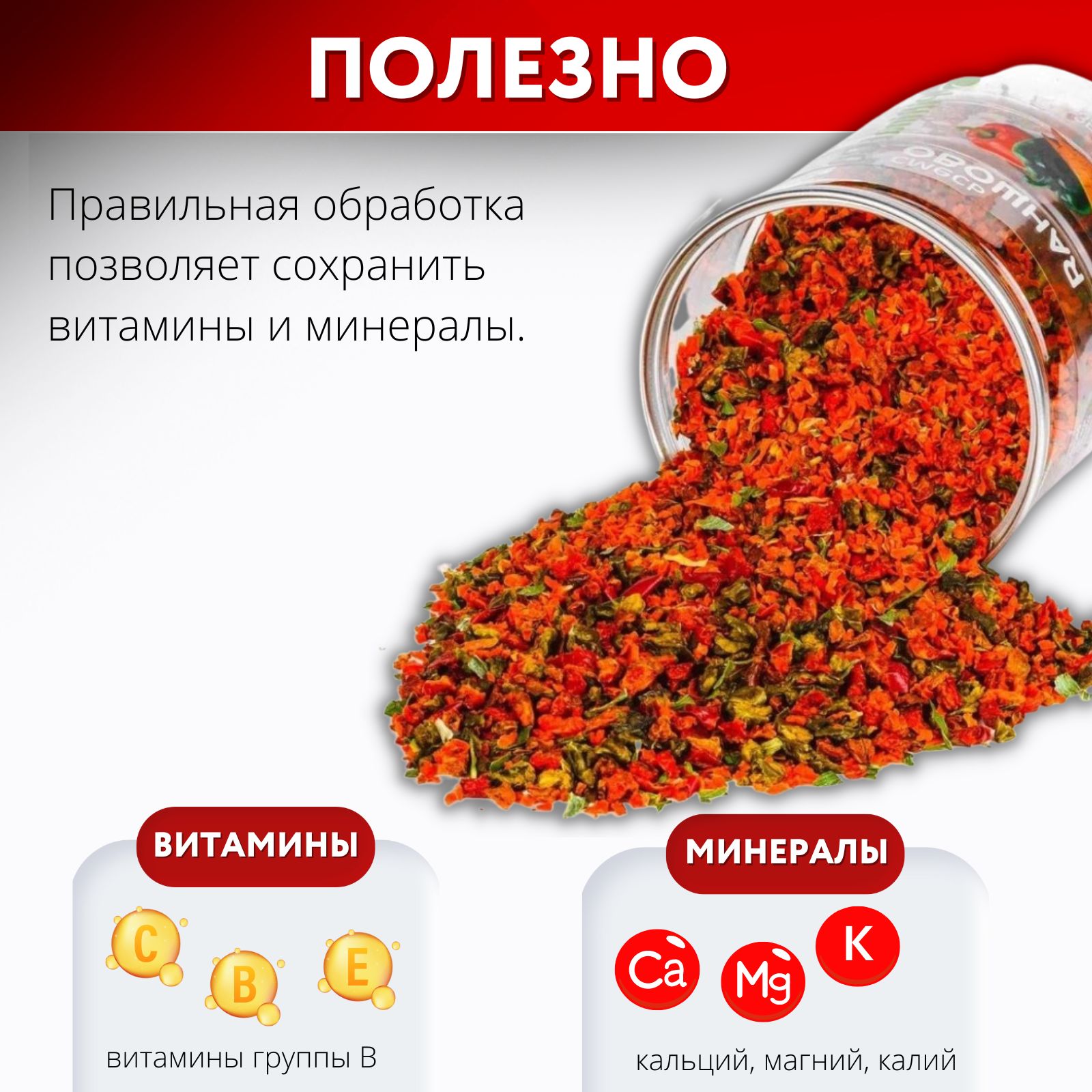 Паприка зеленаяВ сладком перце содержатся витамины С, В1, В2, В9, Р, РР и каротин, поэтому людям страдающим депрессией, сахарным диабетом, а также при ухудшении памяти, бессоннице, упадке сил следует включать перец в меню. По количеству витамина С перец превосходит лимоны и черную смородину.МорковьМорковьМорковь является несомненным лидером по содержанию витамина А. Витамины С и Е помогают замедлить процессы старения, К — повышает свертываемость крови. Калий нормализует сердечно-сосудистую деятельность, кальций и фосфор укрепляют зубы и кости, хлор поддерживает водный баланс в организме.Лук порейЛук порейВ луке-порей, как и в большинстве овощей, содержится много полезных веществ: витамины группы В, витамин С, большое количество калия, а также фосфор, кальций, магний, натрий. Лук-порей полезен при нарушениях пищеварения, при повышенном давлении, при заболеваниях глаз, артрите и подагре.ТоматыТоматыТомат содержит важные биологически активные соединения: каротиноиды, полифенолы и большое количество витамина С. Полифенолы снижают риск возникновения сердечно-сосудистых и онкологических заболеваний. Витамин С — мощный антиоксидант, который укрепляет иммунитет.  Смесь овощная сушеная, 350г, Паприка красная, паприка зеленая, морковь, томаты, лук порейДля супаДля супаДля пловаДля пловаДля мясаДля мясаОсвободите свое времяОсвободите свое времяСушеные овощи – это отличный способ сохранить вкус и пользу свежих овощей на долгое время. Наша компания предлагает широкий ассортимент сушеных овощей высокого качества, которые будут радовать вас своим вкусом и пользой круглый год.
