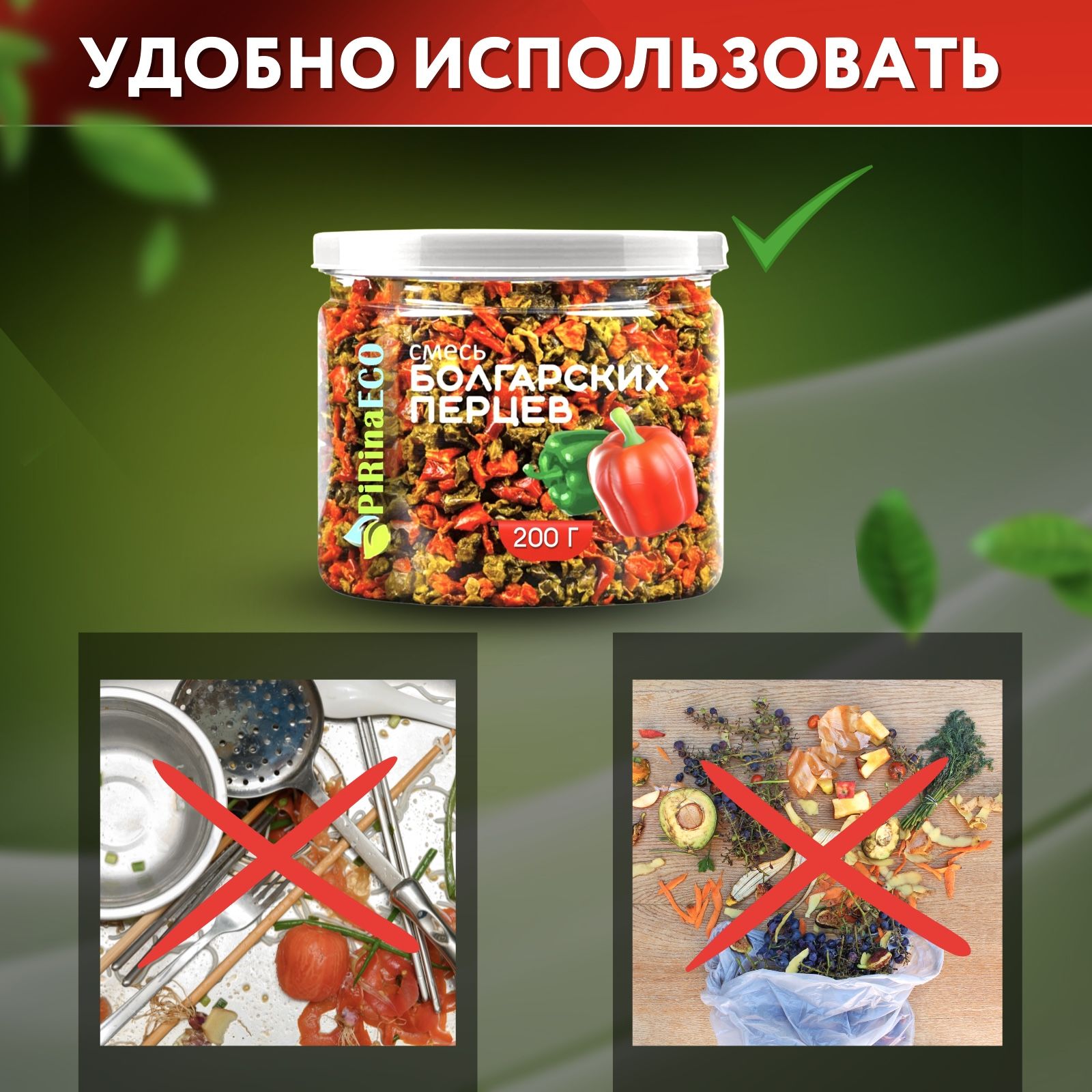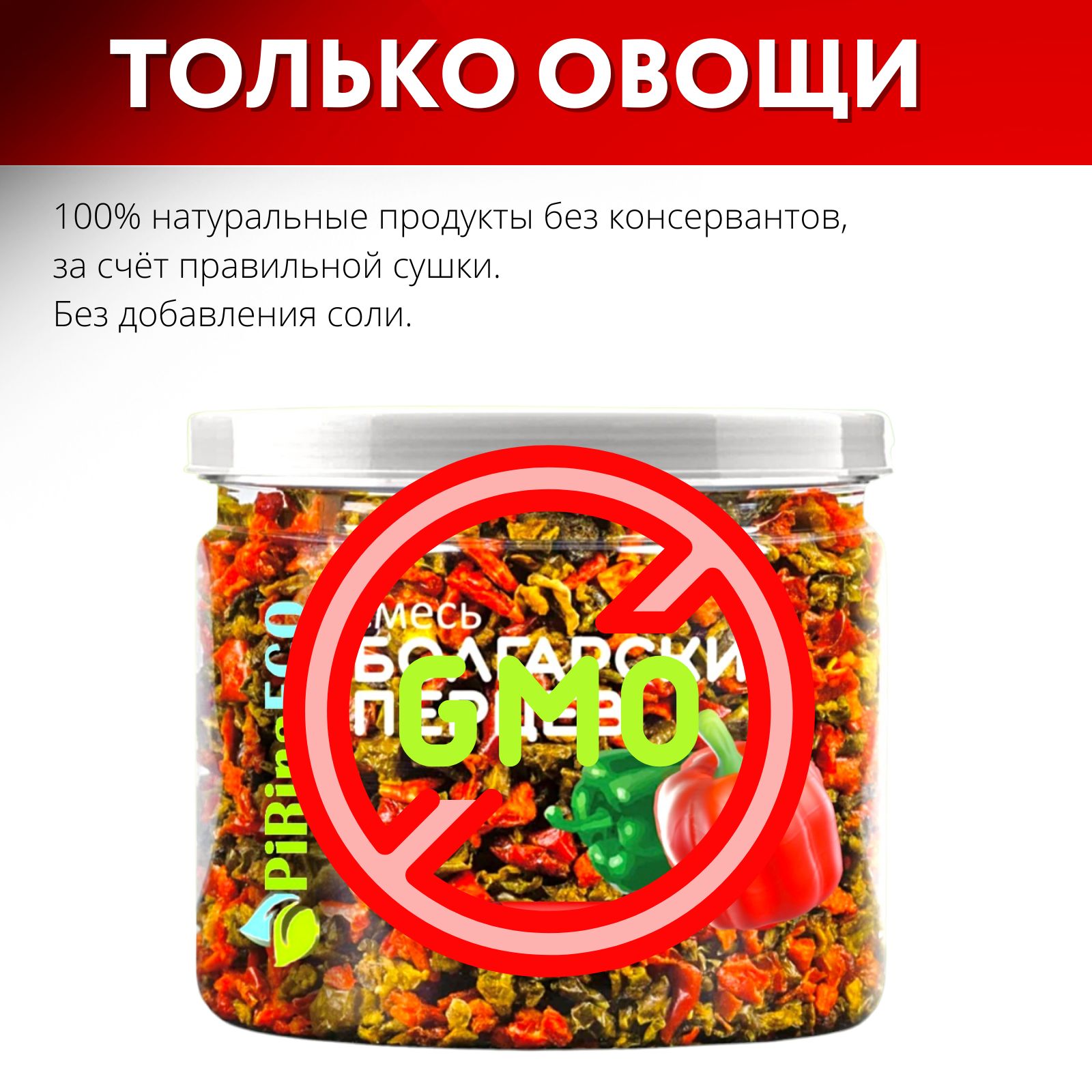 Описание: Pirina ECOНатуральные продукты и добавки для заботы о вашем здоровье и красотеСмесь сушеных Болгарских перцев от Pirina ECOСмесь сушеных Болгарских перцев от Pirina ECOЭто универсальная приправа и Ваш незаменимый помощник на кухне. Мы используем сырье высшего качества. Овощная смесь из Болгарских перцев - это идеальный помол овощей: паприка красная и паприка зеленая. 100% натуральный продукт. За счет бережной сушки сохраняется большое количество витаминов и минералов. Удобная и практичная многоразовая упаковка. Подходит для: первых и вторых блюд. Сэкономьте время, проведенное на кухне. Пригодится как дома, так и в дороге. Мы позаботились о Вас и подготовили популярные универсальные смеси сушеных овощей. Оценят дачники и любители походов. ЗОЖ ПП для веганов и вегетарианцев, паприка, смесь паприк, продукты для дома, приправа для супов, приправа для мяса, приправа из овощей, универсальные специи, специи для мяса.Натуральный продуктНатуральный продуктСмесь сушеных Болгарских перцев от Pirina ECO - это специя премиум класса, которая изготавливается из болгарского сладкого перца.