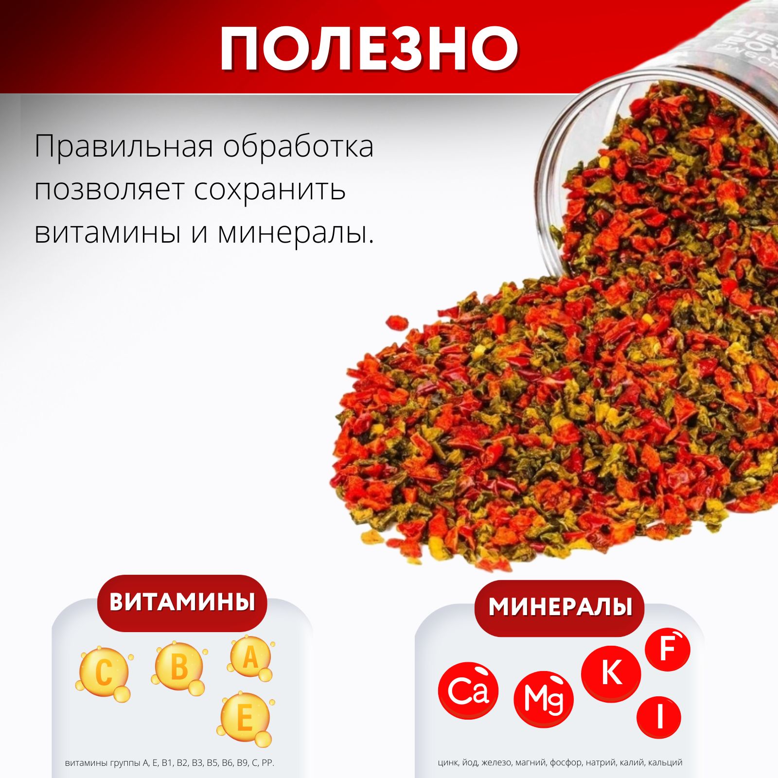 Помимо витаминов А и С, которые важны для человеческого организма, в смеси сушеных перцев от Pirina ECO есть витамины В6 и В9, витамин Е, «поддерживающий» нервную систему в рабочем состоянии. Красный и зеленый перец — рекордсмены по количеству антиоксидантов. Эти антиокислительные вещества помогают защитить организм от негативных соединений.