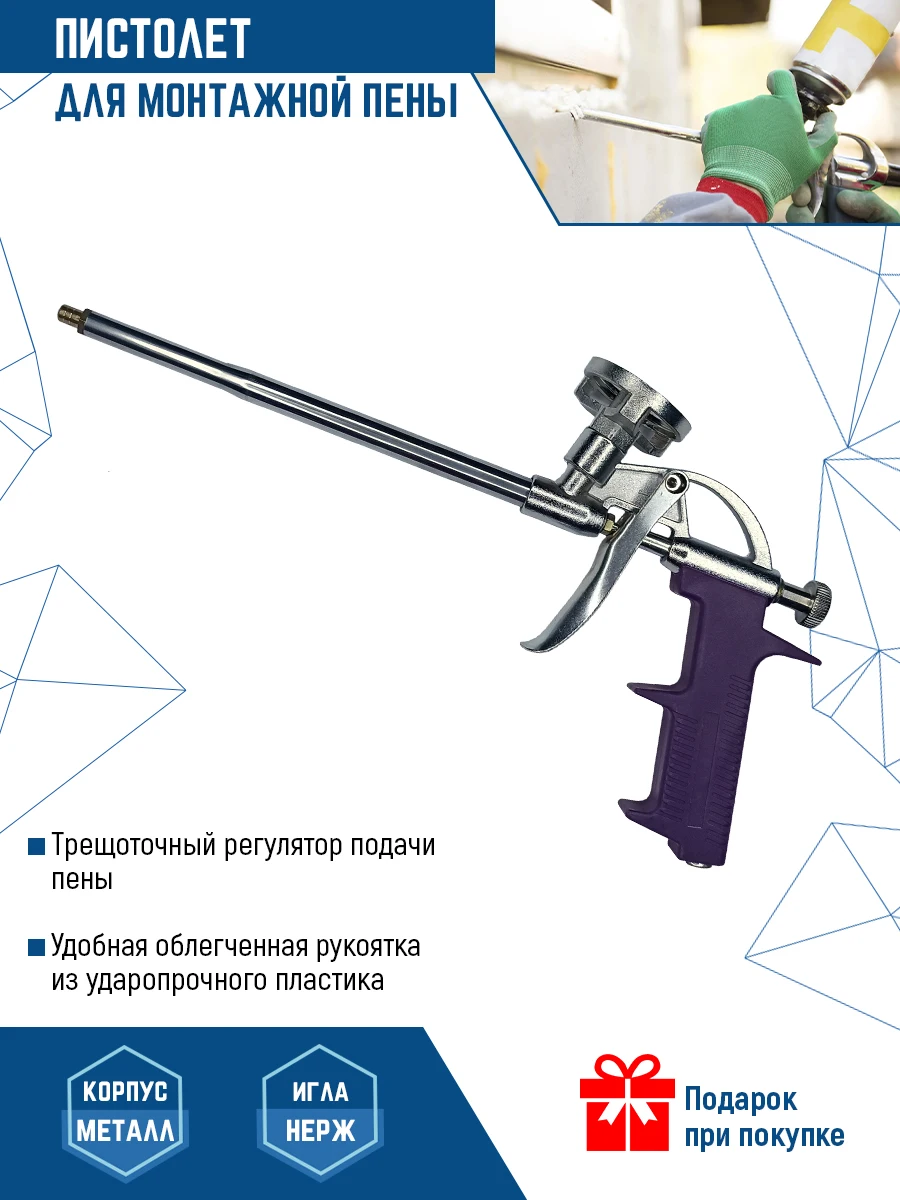 Пистолет для монтажной пены является необходимым инструментом для проведения черновых и финальных отделочных или строительных работ. Пистолеты подходят для монтажной пены, клея, жидких гвоздей и герметика в специальных баллонах. Монтажный пистолет помогает качественной, быстрой и эффективной герметизации трещин, проемов, швов, стыков и прочих отверстий. Работа осуществляется легко и удобно. Этому способствуют правильная конструкция и эффективный рабочий механизм. Пистолет для герметика, благодаря точечному регулятору подачи, позволяет равномерно, точно и дозировано распределить расходный материал. Длинный ствол, который сужен к концу, позволяет производить работу в труднодоступных местах. Строительный пистолет имеет удобную рукоятку из ударопрочного пластика, которая отлично ложится в руку. Пистолет для пены изготовлен из нержавеющей стали, которая не подвержена коррозии. Полировка внутренней поверхности ствола не дает пене налипать, тем самым увеличивая срок службы инструмента.