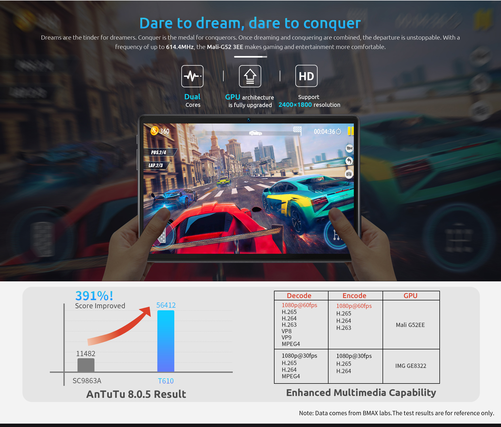 BMAX MaxPad I10 имеет 4 ГБ памяти и 64 ГБ памяти, что быстрее и мощнее. Карта Micro SD может поддерживать расширенное хранилище, предоставляя вам больше места, позволяя смотреть любимые фильмы высокой четкости и наполнять свою прекрасную жизнь.