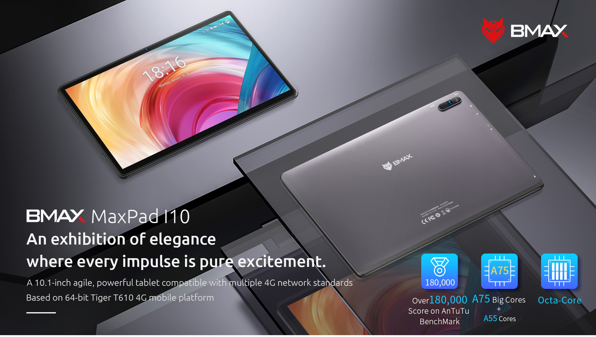 BMAX MaxPad I10 оснащен восьмиядерным процессором, 4 ГБ памяти, 64 ГБ памяти и 10,1-дюймовым экраном 2.5D Arc Edge. Он имеет привлекательный дизайн и высококачественную конфигурацию для удовлетворения потребностей клиентов во многих аспектах.