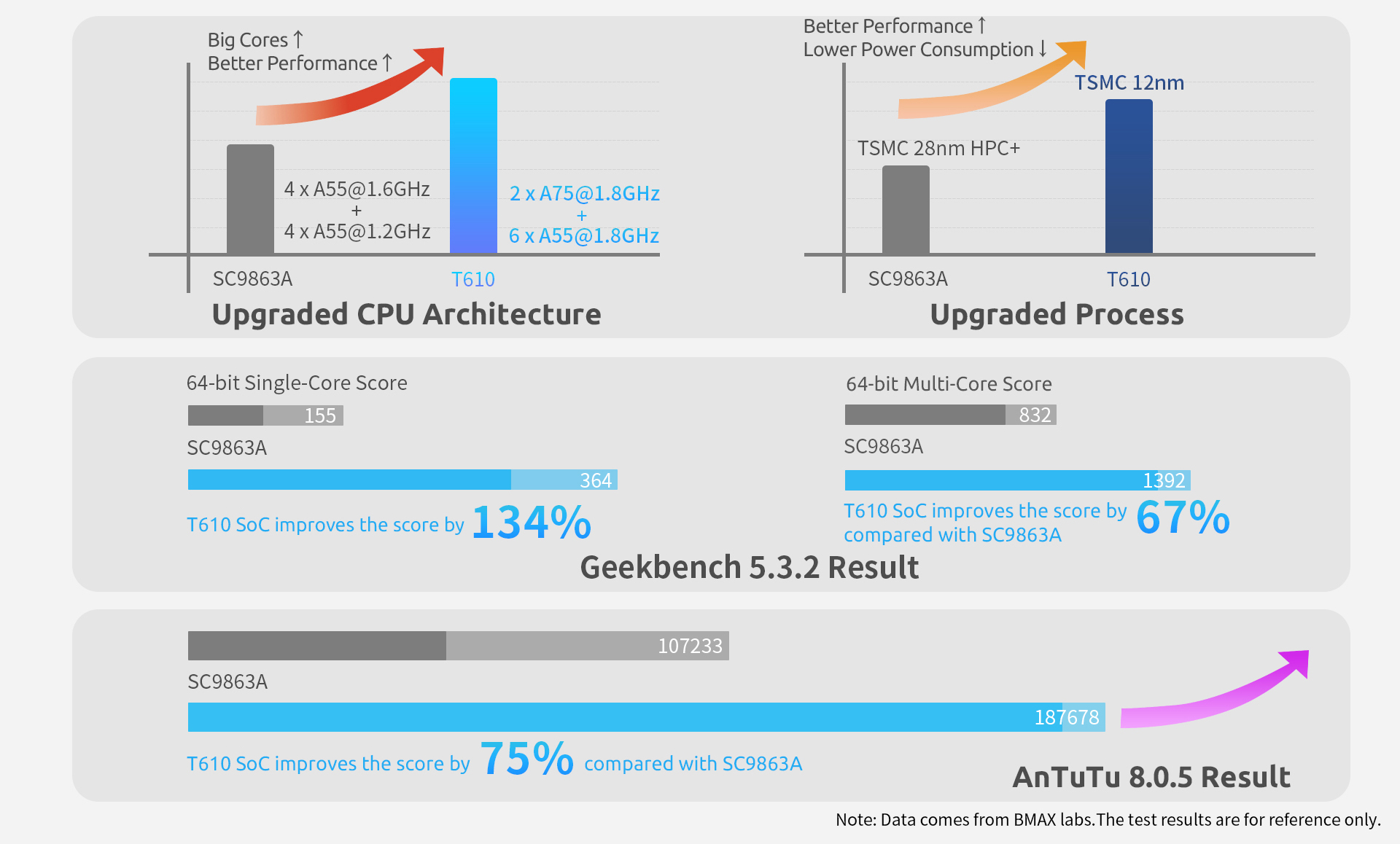 Unisoc Tiger T610-это восьмиядерный SoC начального уровня с двумя быстрыми ядрами ARM Cortex A75 на частоте до 1,8 ГГц и шестью энергоэффективными ядрами ARM Cortex A55 на частоте до 1, 8 ГГц. Почтой ARM G52-3EE