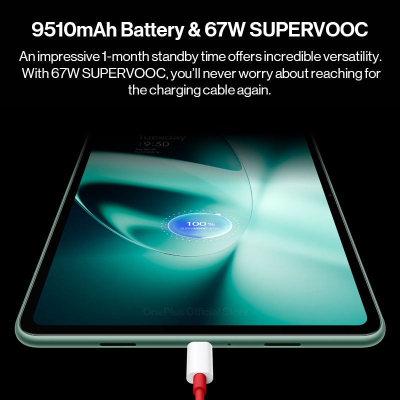 Впечатляющее время ожидания в 1 месяц обеспечивает невероятную универсальность. Возьмите то место, где вы остались, даже после нескольких недель. Работающий от массивной батареи 9510 мАч, достаточной для 12,4 часов воспроизведения видео, ультрапортативный OnePlus Pad выходит за рамки «использовать везде» и «Готов везде».