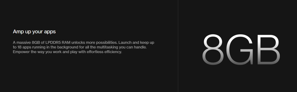 Массивные 8 ГБ оперативной памяти LPDDR5 открывают больше возможностей. Запускайте и поддерживайте до 18 приложений, работающих в фоновом режиме для всех многозадачностей, с которыми вы можете справиться. Укрепите то, как вы работаете и играете, с легкой эффективностью.