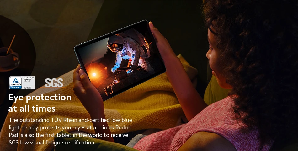Выдающийся дисплей с низким синим светом, сертифицированный TÜV Rheinland, всегда защищает ваши глаза. Redmi Pad также является первым планшетом в мире, полученным сертификат SGS с низким уровнем зрительной усталости. Четырехъядерный динамик с поддержкой Dolby Atmos®