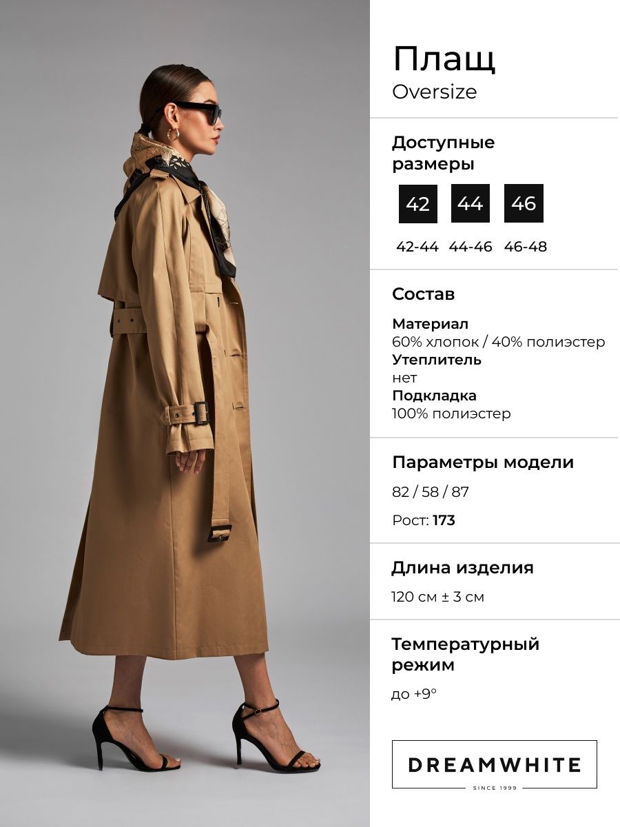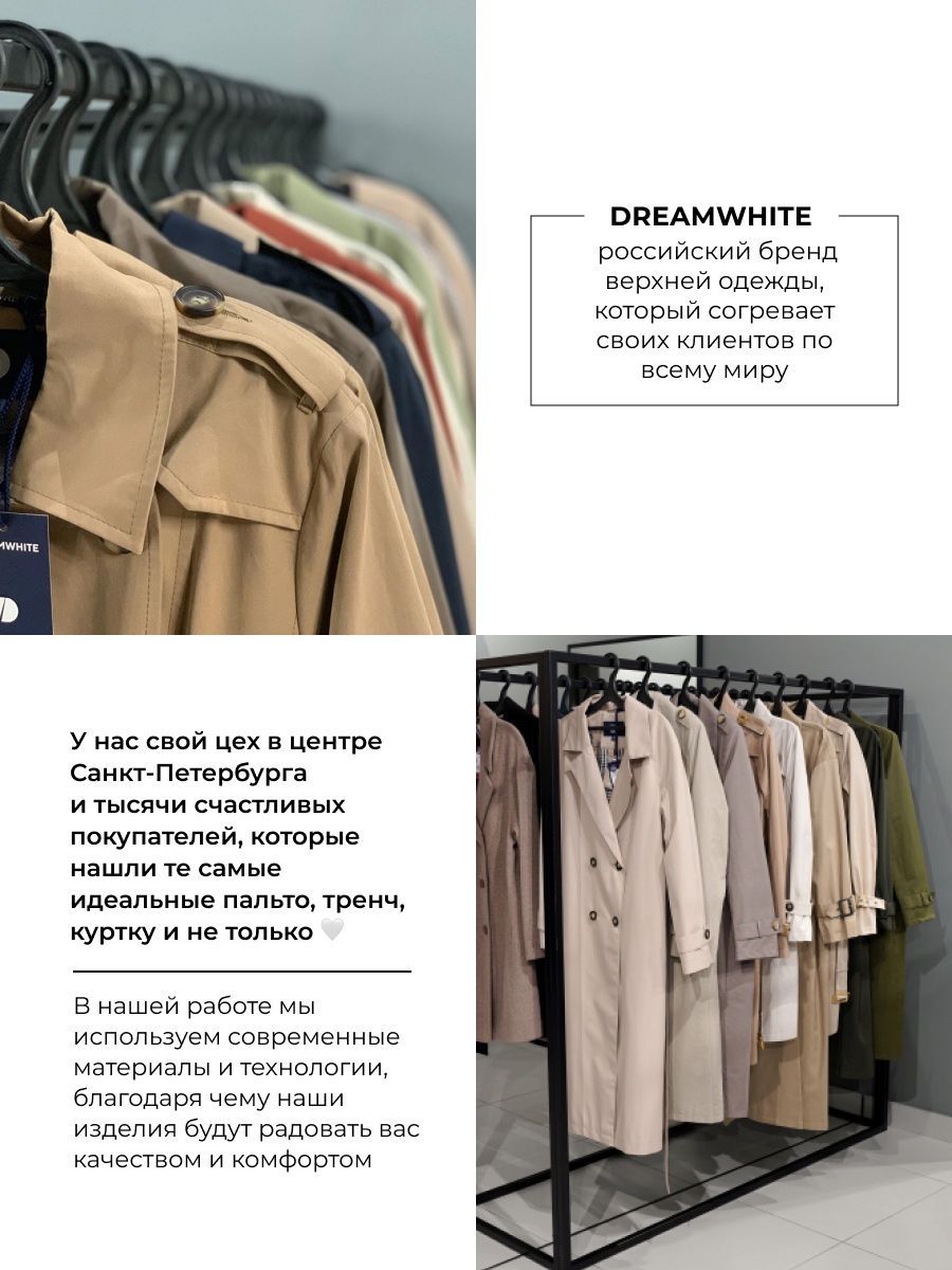 Описание: Ищите идеальный демисезонный женский плащ? Тренчкот осенний выполнен из плотной ткани с 60% содержанием хлопка, благодаря водоотталкивающей пропитке, вам будет комфортно в классическом тренче при любой погоде. Длина хлопкового плаща на осень, фиксированная для всех размеров - 120 см, (+/- 1-3 см). Летнее пальто отличное решение для высоких и невысоких девушек. Рукав реглан и прямой крой дает возможность создавать стильные образы. Длина демисезонного тренча позволит носить его как с брюками, так и с юбками. Тренчкоты и плащи на осень весну подойдут для девушек, девочек и подростков. Отличная альтернатива женской короткой куртке, дождевику и пальто. На смену бомберу и косухе. База в отличии от женского стеганого плаща. Стильный крой, из дополнении идеально подойдет платок и сумка. Сочетается с шарфом и поясом. Тренчкот с кокеткой для девочек и женщин приятный подарок подруге. маме, сестре. Дочери ко дню рождения, на свадьбу, 8 марта. Удлиненный хлопковый тренч отшит в 3-х размерах. Соотнесите ваши параметры с размерной сеткой изделия, чтобы выбрать подходящий размер. Рекомендации по уходу: стирайте отдельно от других вещей на деликатном режиме при температуре не выше 30С. Не используйте хлорсодержащие и прочие абразивные средства. Рекомендуем запустить дополнительный круг полоскания, чтобы избежать разводов. Сушить изделие лучшее всего в расправленном виде на сушилке в дали от нагревательных приборов и прямых солнечных лучей. Гладить тренчкот двуцветный можно на минимальных температурах утюга, через дополнительны слой ткани. Так же вы можете воспользоваться отпаривателем выбрав деликатный режим Наши модели сезона лето-осень 2023 имеют влагозащитную пропитку, которую со временем необходимо обновлять. Вы можете самостоятельно обработать специальным составом или воспользоваться такой услугой в химчистке. Осенняя коллекция представлена в базовых цветах : хаки и черный, бежевый, а так же в уникальных сочетаниях молочном и черном, для ваших прекрасных образов. В Дрим вайт вы найдете стильную модную верхнюю одежду, а также аксессуары и трикотажные изделия.