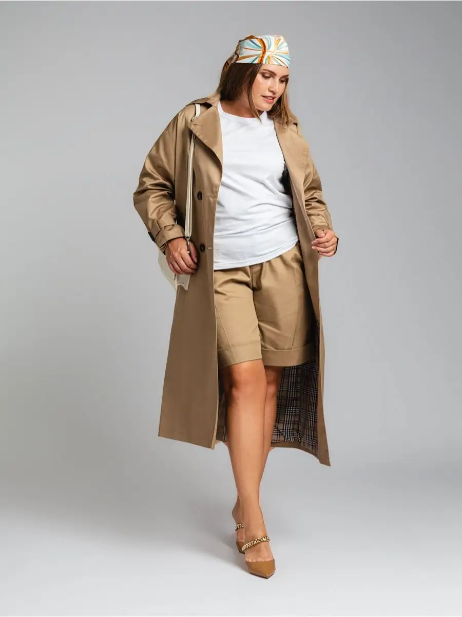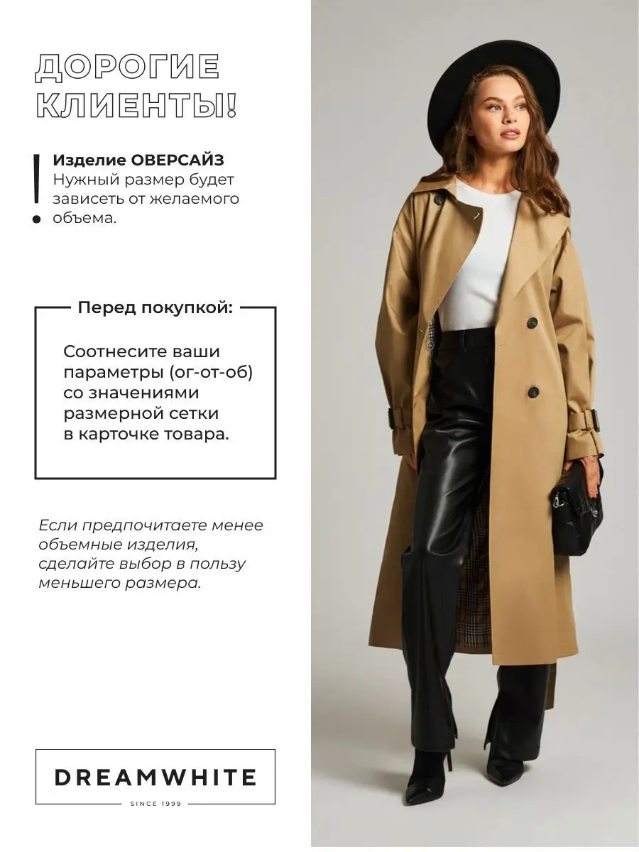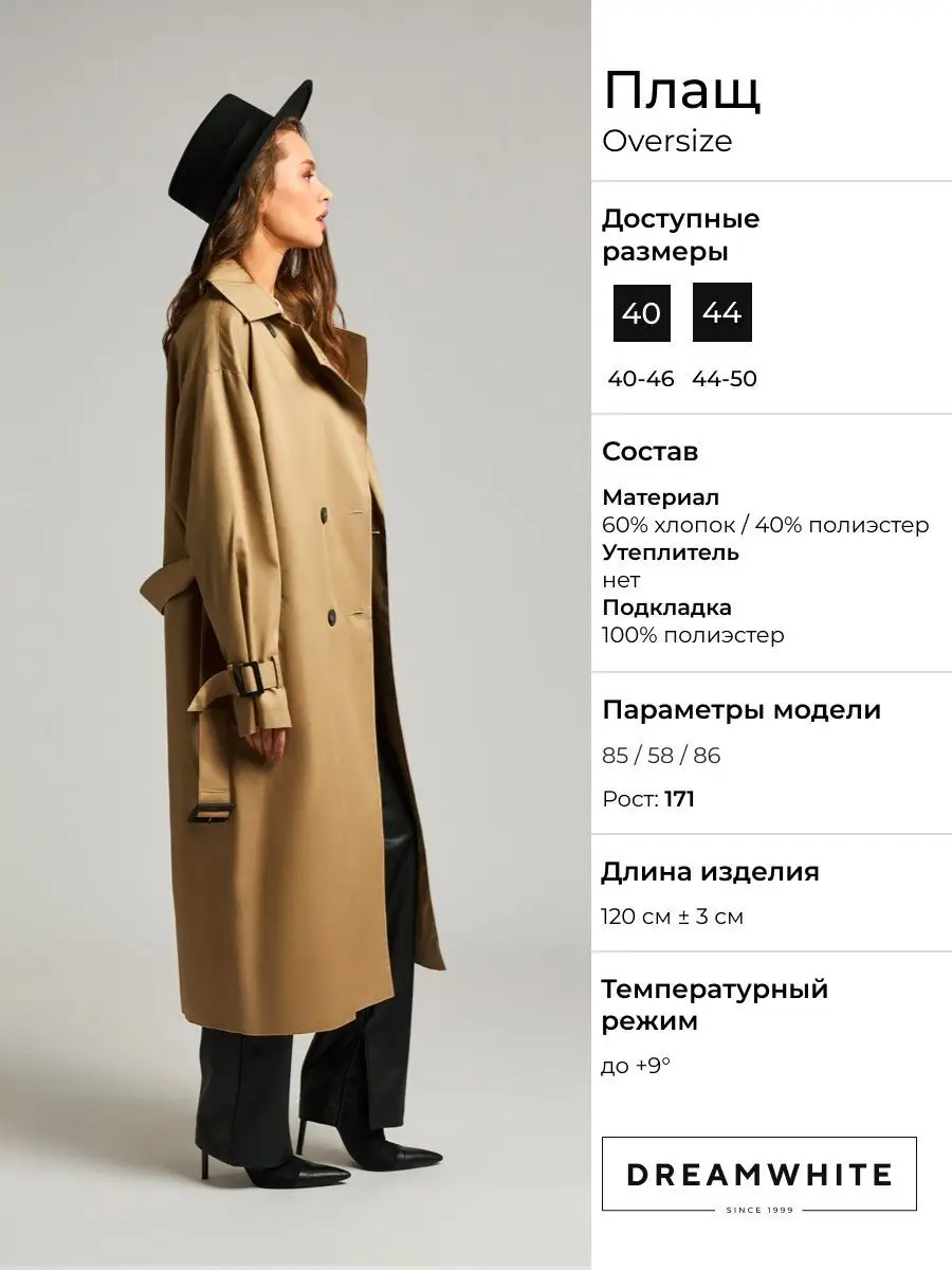 Описание: Идеальный демисезонный женский плащ оверсайз от Дримвайт. Тренчкот осенний выполнен из плотной ткани с 60% содержанием хлопка, благодаря водоотталкивающей пропитке, вам будет комфортно в длинном тренче при любой погоде. Длина хлопкового плаща, фиксированная для всех размеров - 120 см, (+/- 1-3 см ). Плащ на осень женский отличное решение для высоких и невысоких девушек. Спущенный рукав и свободный крой позволяет создавать стильные и многослойные образы с базовым плащом с поясом. Длина демисезонного тренча позволит носить его как с брюками, так и с юбками. Наши тренчкоты и плащи женские на осень весну подойдут для девушек больших размеров, подростков. Демисезонный тренчкот с подкладом отличная альтернатива женской куртке, пальто, дождевику, косухе, стеганному и кожаному плащу. Летний плащ незаменимый атрибут верхней одежды. К базовому тренчкоту идеально подойдет платок, сумка, шарф, пояс. Модный тренч без кокетки отшит в универсальных цветах: несколько оттенков бежевого, зеленый, коричневый, хаки. Плащ классический с подкладкой для девочек и женщин приятный подарок подруге, маме, учителю, ко дню рождения, на свадьбу, 8 марта, 14 февраля. Удлиненный хлопковый плащ отшит в 2-х размерах: 40 и 44. 40-й подойдет на размеры с 40 по 46, а 44-й с 44 по 48. Для выбора своего идеального размера обратитесь к размерной сетке в фотографиях товара. Плащи подойдут для девушек большого размера, для беременных, а также для подростков в школу, идеально сочетается с худи, объемными толстовками. Так же вы можете создать женственный образ добавив шляпу или берет, перчатки и сумку, Стирайте плащ отдельно от других вещей на деликатном режиме при температуре н выше 30С. Не используйте хлорсодержащие и прочие абразивные средства. Рекомендуем запустить дополнительный круг полоскания, чтобы избежать разводов. Сушить осенний бежевый плащ лучше всего в расправленном виде на сушилке в дали от нагревательных приборов и прямых солнечных лучей. Гладить изделие можно на минимальных температурах утюга, через дополнительны слой ткани. Так же вы можете воспользоваться отпаривателем выбрав деликатный режим. Наши плащи сезона лето-осень 2023 имеют влагозащитную пропитку, которую со временем необходимо обновлять. Вы можете самостоятельно обработать плащ летний женский специальным составом или воспользоваться такой услугой в химчистке. В Дрим вайт для вас самая стильная верхняя одежда, а также аксессуары и трикотажные изделия.