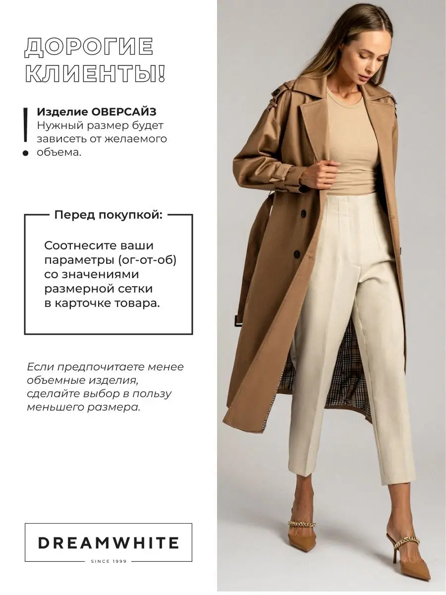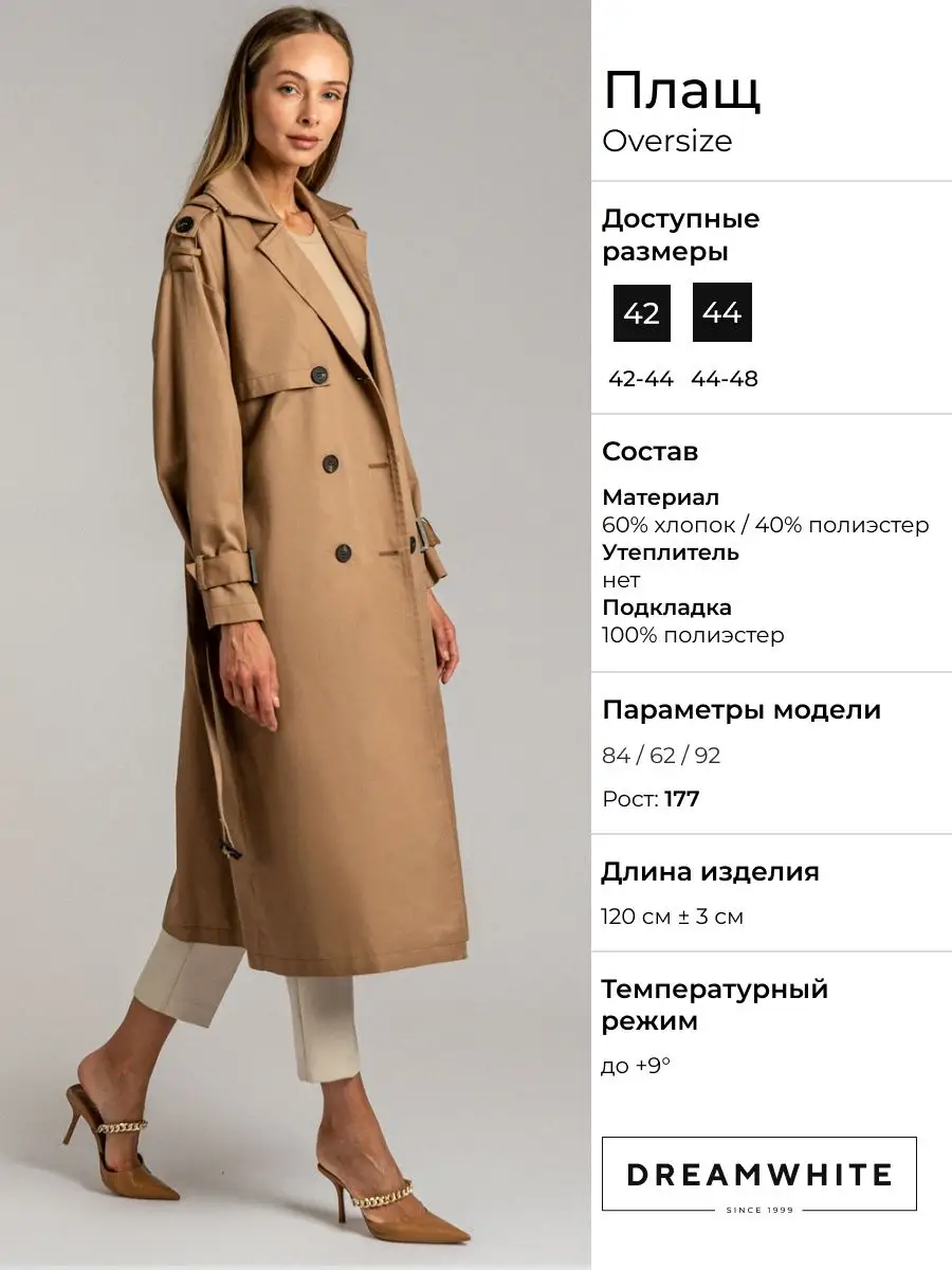 Описание: Классический женский удлиненный осенний плащ — важный элемент повседневного гардероба на лето и осень. Тренчкот Дримвайт отшит из качественной плотной ткани с содержанием 60% хлопка. Двубортный плащ обработатан водоотталкивающим составом, который защищает от дождя, при этом не утяжеляя ткань. Погоны, кокетка, манжет и отложной воротник — это отличительные детали базового тренчкота, который придется по вкусу каждой девочке. девушке, женщине, подростку. Длина плаща демисезонного — 120 см, (+/- 1-3 см ), что позволяет с легкостью комбинировать его в образах с брюками и юбками. Качественная фурнитура стильной и модной одежды и продуманный крой оверсайз подойдет для больших размеров. Такие демисезонные летние пальто отличный выбор для беременных, для тех, кто предпочитает свободный крой. Плащевое пальто — базовая верхняя одежда для лета и осени. Для выбора подходящего размера соотнесите ваши параметры и параметры изделия, которые указаны на слайдах в карточке товара. Уход за плащом: Стирайте отдельно от других вещей на деликатном режиме при температуре не выше 30С. Не используйте хлорсодержащие и прочие абразивные средства. Рекомендуем запустить дополнительный круг полоскания, чтобы избежать разводов. Сушить в расправленном виде на сушилке вдали от нагревательных приборов и прямых солнечных лучей. Гладить на минимальных температурах утюга через дополнительный слой ткани. Также вы можете воспользоваться отпаривателем, выбрав деликатный режим. Тренчкот осенний свободного кроя станет прекрасной альтернативой куртке укороченной, дождевику, а также заменит длинный черный кожаный тренч или тренчкот стеганный короткий. Наши тренчи имеют влагозащитную пропитку, которую со временем необходимо обновлять. Вы можете самостоятельно обработать изделие специальным составом или воспользоваться такой услугой в химчистке. В DreamWhite широкий ассортимент верхней женской одежды, трикотажа и аксессуаров.
