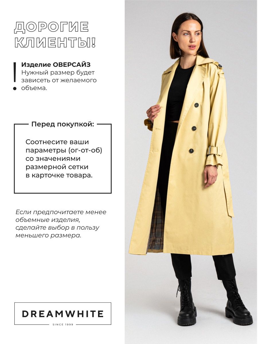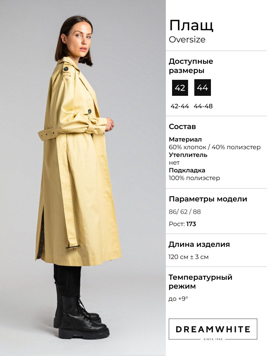 Описание: Классический женский удлиненный осенний плащ — важный элемент повседневного гардероба на лето и осень. Тренчкот Дримвайт отшит из качественной плотной ткани с содержанием 60% хлопка. Двубортный плащ обработатан водоотталкивающим составом, который защищает от дождя, при этом не утяжеляя ткань. Погоны, кокетка, манжет и отложной воротник — это отличительные детали базового тренчкота, который придется по вкусу каждой девочке. девушке, женщине, подростку. Длина плаща демисезонного — 120 см, (+/- 1-3 см ), что позволяет с легкостью комбинировать его в образах с брюками и юбками. Качественная фурнитура стильной и модной одежды и продуманный крой оверсайз подойдет для больших размеров. Такие демисезонные летние пальто отличный выбор для беременных, для тех, кто предпочитает свободный крой. Плащевое пальто — базовая верхняя одежда для лета и осени. Для выбора подходящего размера соотнесите ваши параметры и параметры изделия, которые указаны на слайдах в карточке товара. Уход за плащом: Стирайте отдельно от других вещей на деликатном режиме при температуре не выше 30С. Не используйте хлорсодержащие и прочие абразивные средства. Рекомендуем запустить дополнительный круг полоскания, чтобы избежать разводов. Сушить в расправленном виде на сушилке вдали от нагревательных приборов и прямых солнечных лучей. Гладить на минимальных температурах утюга через дополнительный слой ткани. Также вы можете воспользоваться отпаривателем, выбрав деликатный режим. Тренчкот осенний свободного кроя станет прекрасной альтернативой куртке укороченной, дождевику, а также заменит длинный черный кожаный тренч или тренчкот стеганный короткий. Наши тренчи имеют влагозащитную пропитку, которую со временем необходимо обновлять. Вы можете самостоятельно обработать изделие специальным составом или воспользоваться такой услугой в химчистке. В DreamWhite широкий ассортимент верхней женской одежды, трикотажа и аксессуаров.