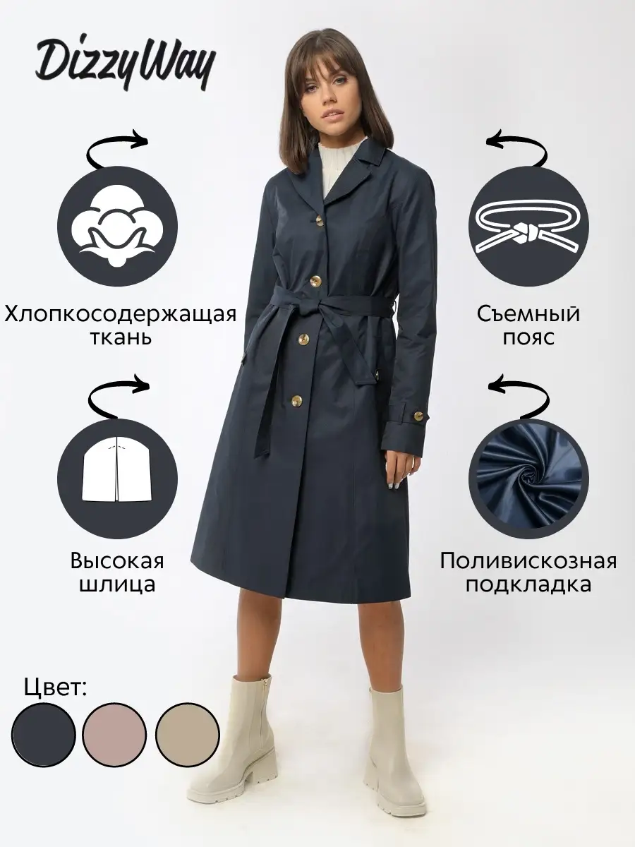 Описание: Плащ для женщин и девушек на весну и осень - универсальный классический предмет гардероба. Легкая верхняя одежда с лаконичным прямым силуэтом актуальна всегда. В магазине представлены 42, 44, 46, 48, 50, 52, 54, 56, 58, 60, 62 размеры. Удлиненное легкое пальто будет хорошо смотреться на фигуре любого типа. Вы можете подчеркнуть талию при помощи съемного пояса. Втачные рукава оформлены патой, которая позволяет регулировать их длину. Прорезные карманы оформлены декоративными клапанами. Есть внутренний карман. Подкладка из поливискозы в тон основной ткани приятна на ощупь. Пуговицы и петли - классический вариант застежки. В весеннее и осеннее время стильная куртка позволит вам прекрасно выглядеть в любое время. В каталоге размещены следующие расцветки: песочный, темно-синий, светло-сиреневый. Понравится тем, кому необходимы: черное пальто, стеганное пальто, плащ на осень, весеннее пальто, зимняя куртка, двубортное пальто, теплое пальто, осеннее пальто