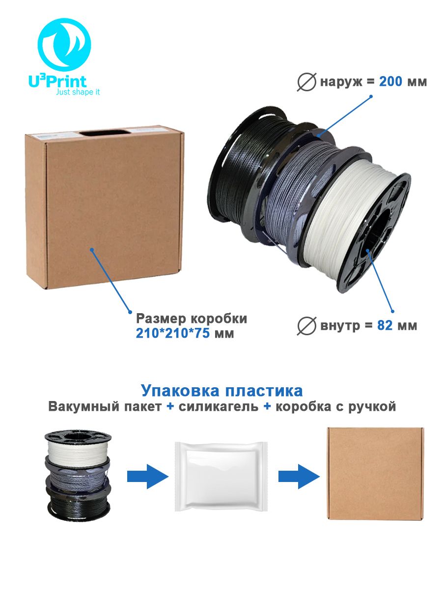Пруток 1,75 мм 1 кг на катушке, силикогель, вакуумный пакет, коробка.