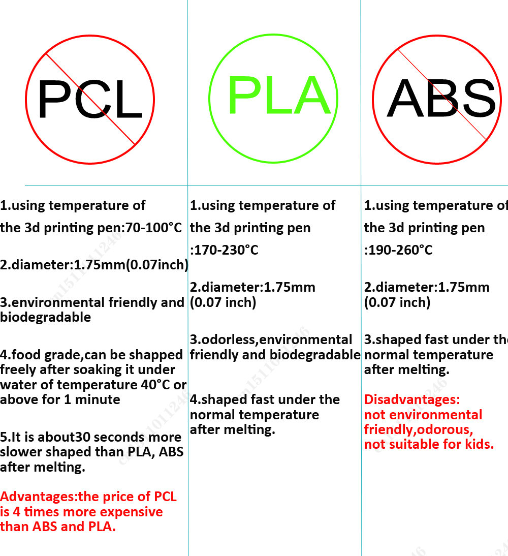 3. Здесь есть 2 типа нитей на Ваш выбор: ПЛК и PCL.ПЛАНитьРабочая температура составляет180 ° ~ 230 °, ПКЛНитьРабочая температура ≤ 40 ℃, поэтому выберите правильныйНить для вашей 3D-ручки, спасибо!