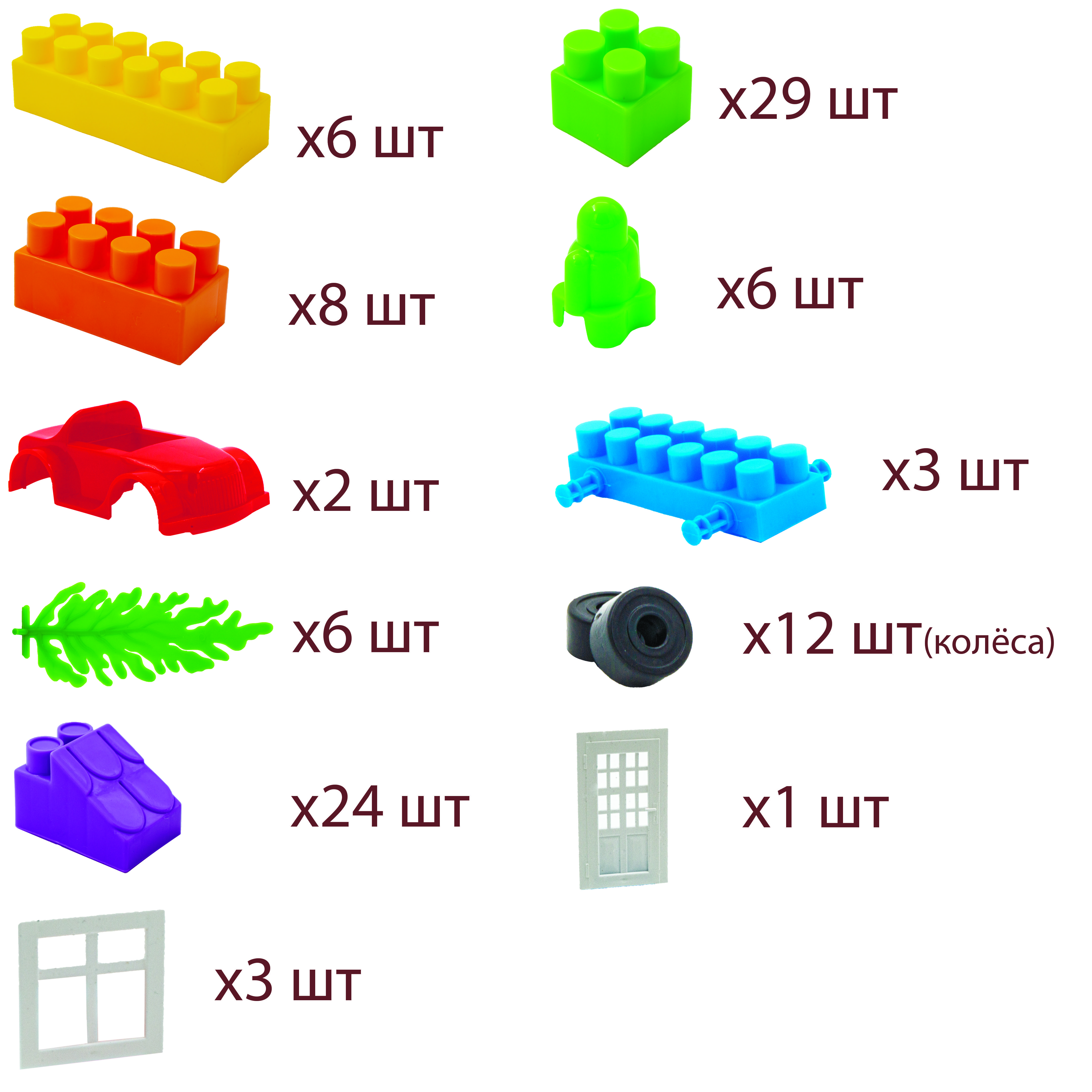 Описание: Конструктор для детей Комби Блок 100 деталей Вы и без нас знаете, что конструктор это самая популярная игрушка для детей. Помимо удовольствия от игры, ребенок развивает моторику, фантазию, усидчивость, учит цвета и тренирует многие другие навыки. Не забывайте участвовать в процессе сборки, чтобы ребенок учился находить общий язык и работать в команде.На любой вкус100 разноцветных деталей с размерами от 3 см до 5 см не оставят равнодушными ни одного малыша (иногда и родителей:)) В состав набора входят: блоки, машинки, деревья, окна, двери и человечки. Дайте волю воображению - стройте дома, гаражи, животных, самолеты, машины, роботов и многое другое. ВАЖНО - колеса и другие ЛЮБЫЕ детали входят в счёт количества деталейБезопасен Конструктор Комби Блок производится в России. Изготовлен из безопасных материалов и имеет все необходимые сертификаты качества – можете быть спокойны. Стройте, развивайтесь, изучайте, тренируйтесь и просто получайте удовольствие от игры !