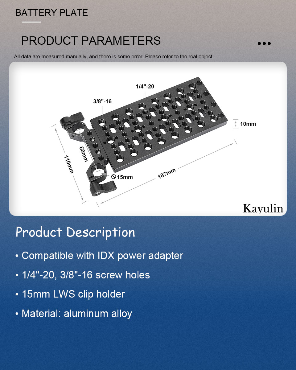 Универсальная Монтажная пластина с кронштейном крепления LWS 15 мм, отверстиями 1/4 "-20 и 3/8"-16, посередине есть ряд установочных отверстий для удобства и устойчивости, позволяя подключать шарнирные рычаги, стержни, батареи и преобразователи. Коробки и различные другие аксессуары для камеры крепятся к вашей опорной системе.