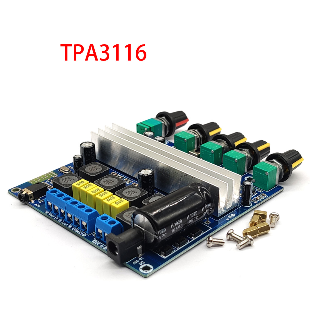 Это одиночный источник питания постоянного тока 12-24 В с использованием высокопроизводительного цифрового усилителя мощности TI TPA3116D2 в качестве ядра, один для параллельного мостового усилителя мощности, И другой для выхода усилителя мощности левого и правого каналов. Он может поддерживать 100 Вт (басовый канал) + 50 Вт (левый канал) + 50 Вт (правый канал) трехканальный выход.