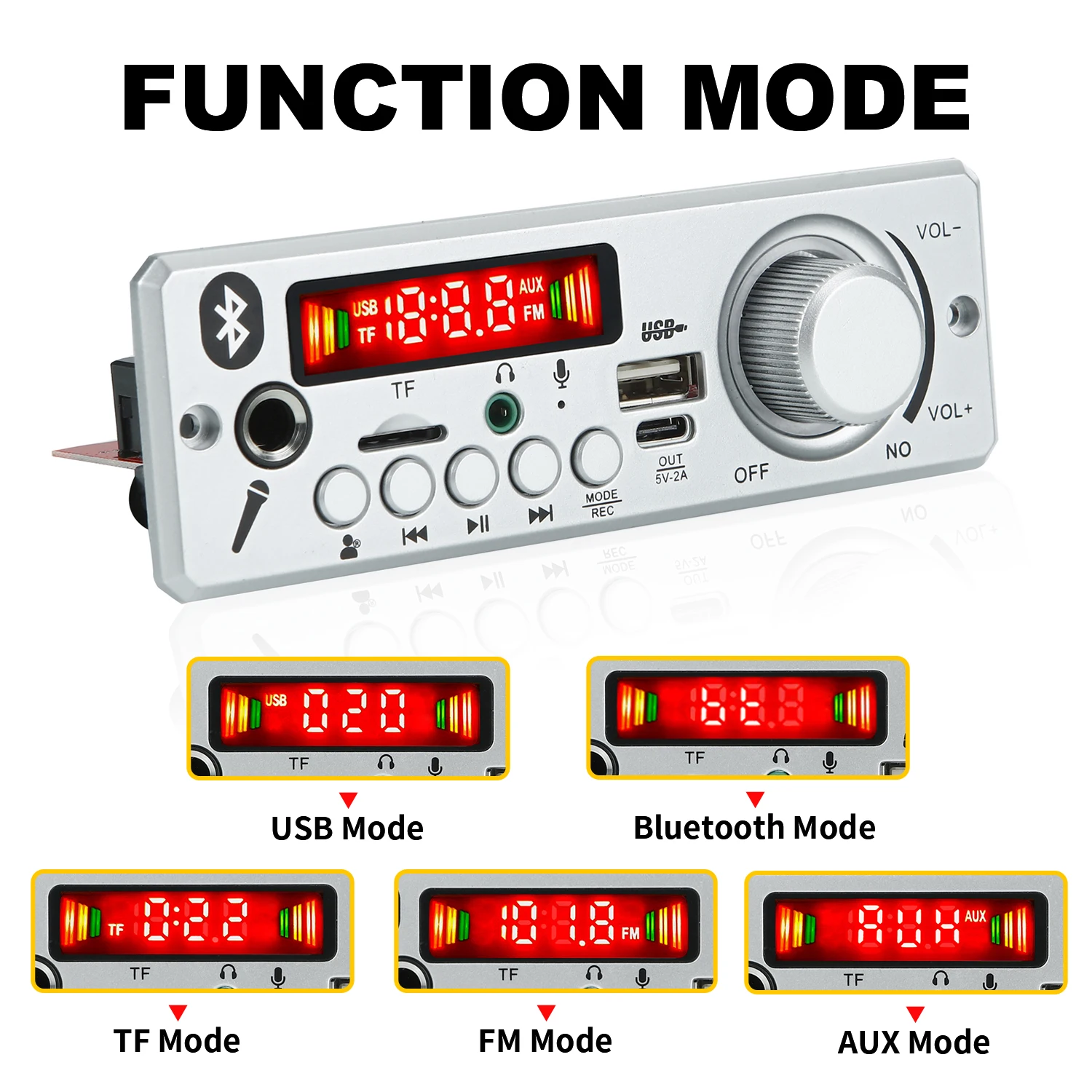 1. Автоматическая поддержка переключения USB / TF / Bluetooth / FM / AUX. Подсказка и преобразование в кабель (звук сигнала или английский голос опционально)