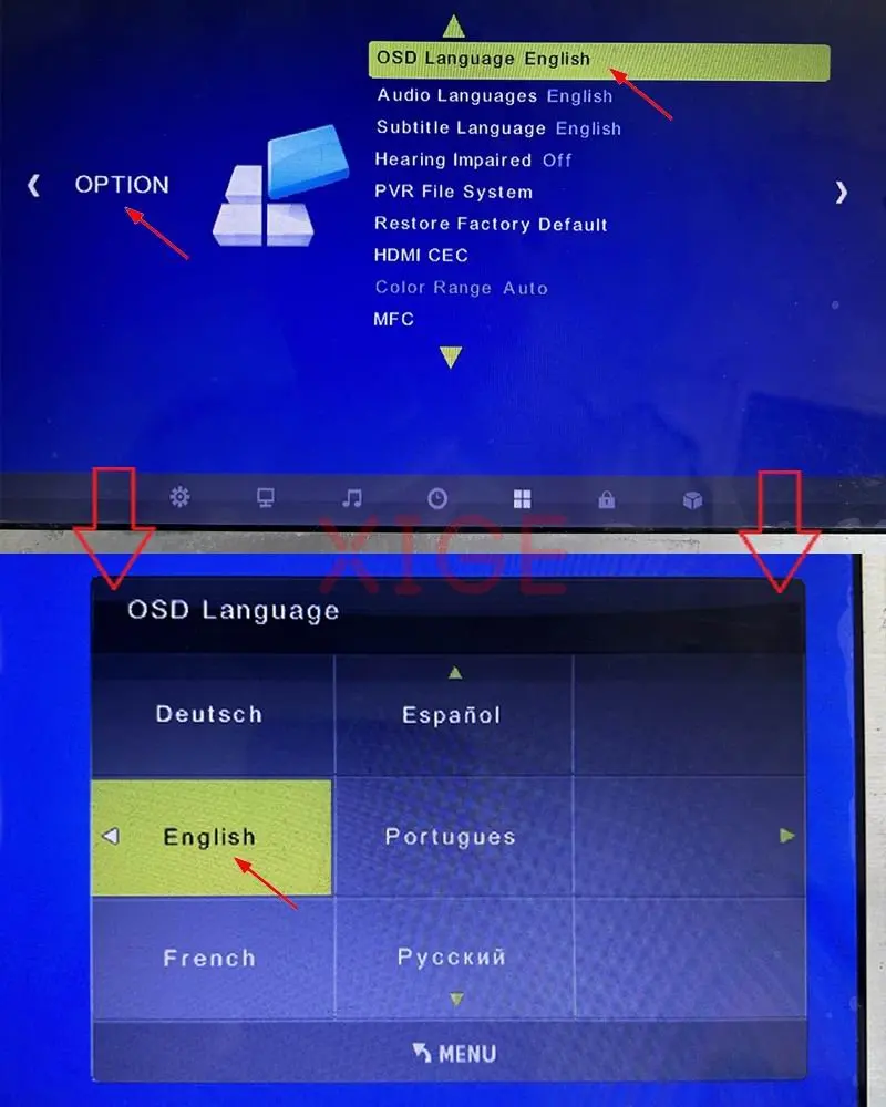 6. Пожалуйста, обратитесь к фотографиям ниже для подключения кабеля экрана и языковых настроек. (Экранное меню имеет несколько интерфейсов. Если отличается, свяжитесь с нами)