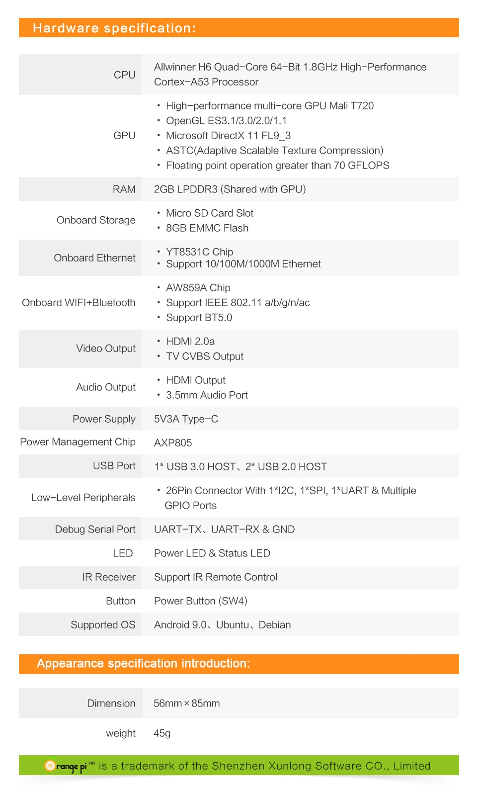 Плата компьютерная Orange Pi 3 LTS, 2 Гб ОЗУ, AllWinner H6 8 ГБ EMMC
