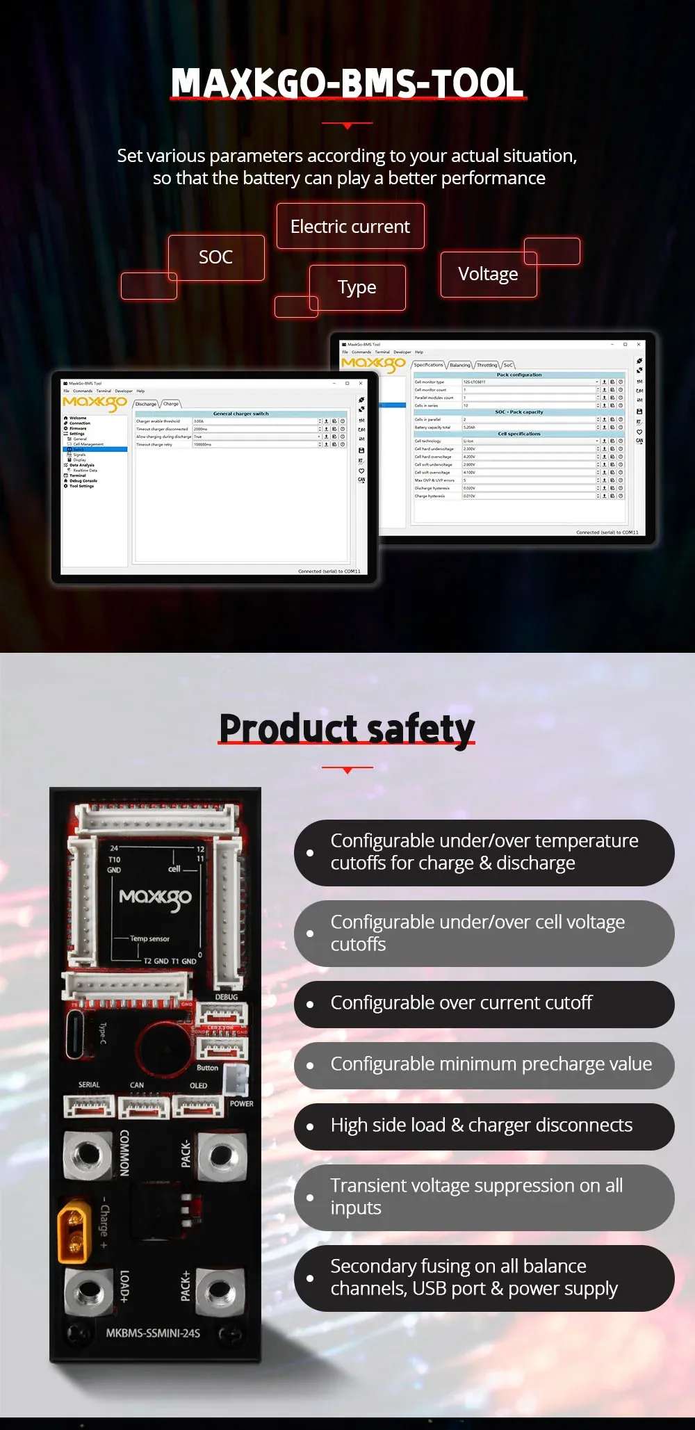 • Настройка и обновление прошивки через USB через MAXKGO-BMS-TOOL и ENNOID-BMS-TOOL.