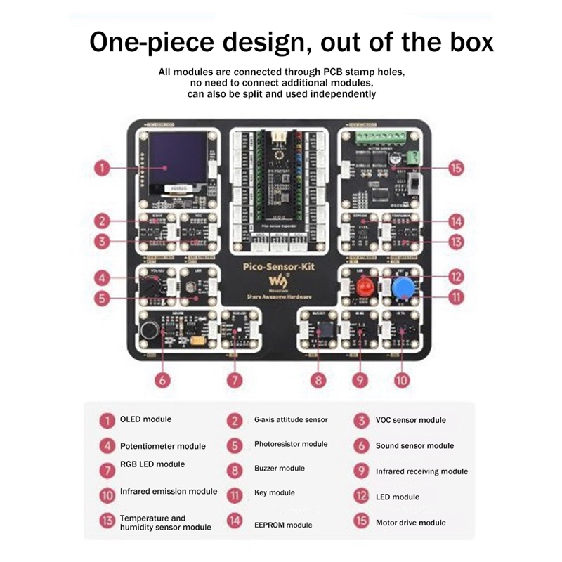 Содержит 15 общих модулей, таких как светодиоды, кнопки и гудки, которые могут быть разделены и использованы независимо