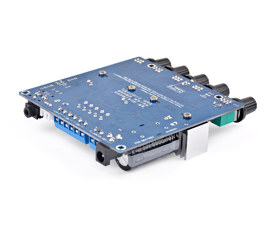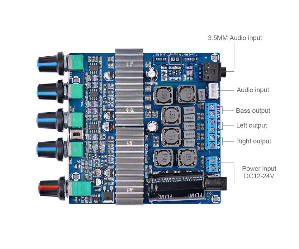 12-24V power supply, using TI's TPA3116 high-performance digital power amplifier chip as the core, one to do parallel bridged bass channel power amplification output, one to do left and right channel power amplification output.support 100W (bass channel) + 50W (left channel) + 50W (right channel) three-channel output.