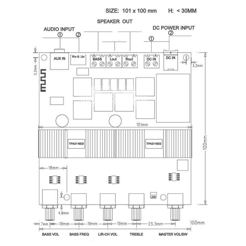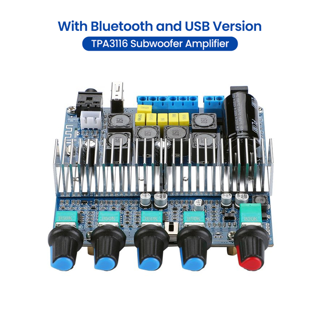 2 .Support Bluetooth 5.0 audio reception , external audio input interface, with preamplifier, bass crossover processing; bass volume, bass frequency, left and right channel volume, treble, function control switch / total volume, 5 adjustment potentiometers.