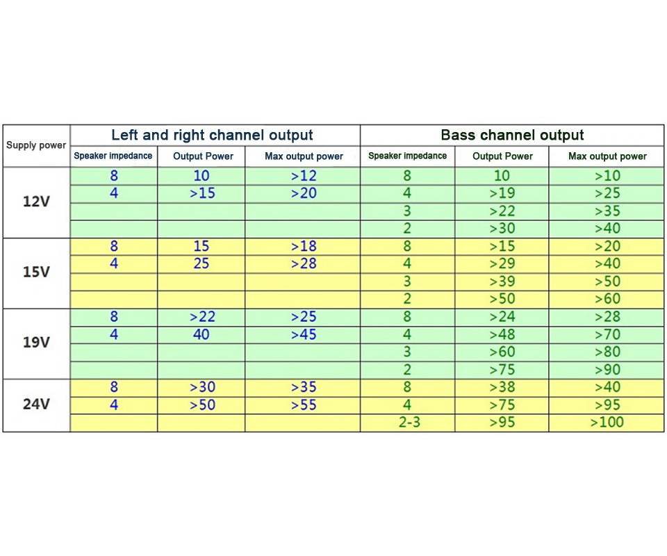Power and power supply voltage, the amplitude of the sound source signal, the size of the speaker impedance are all related, any kind of deficiency will affect the power