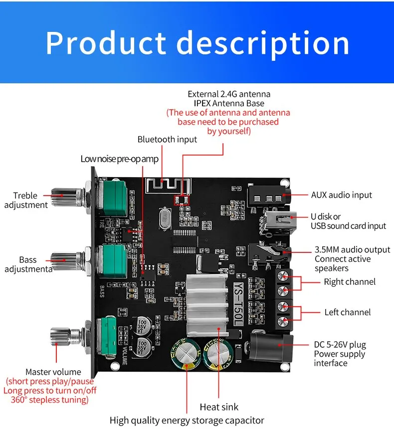Название продукта: 50 Вт + 50 Вт Регулируемый стерео Bluetooth-совместимый усилитель мощности с высокими и низкими басами