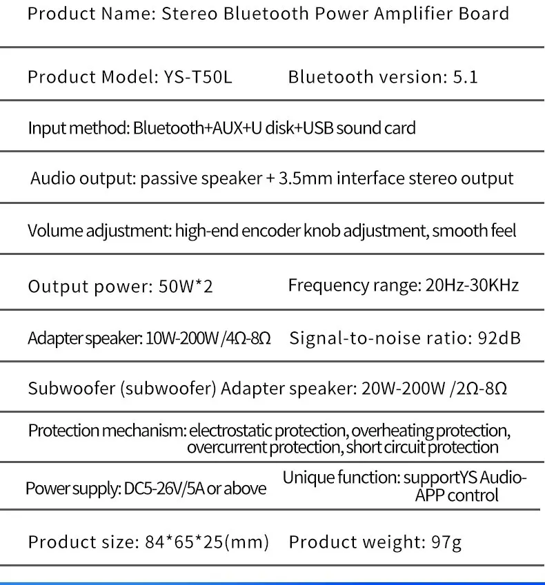 YS-T50L 2X50 Вт HIFI 2,0 Динамик Цифровой аудио Плата усилителя мощности 3,5 мм TO Аудио Стерео Bluetooth-совместимое приложение 5,1 А