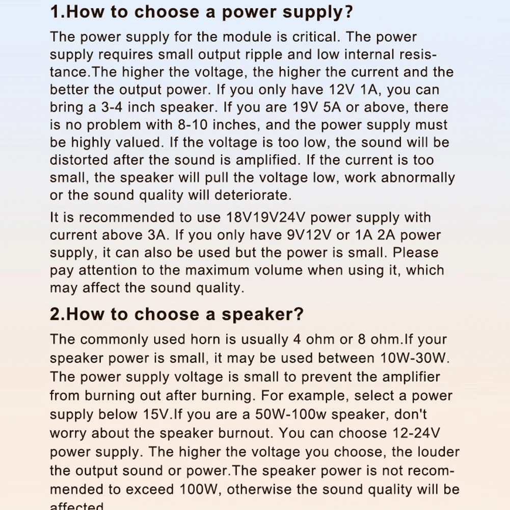 Чем выше напряжение источника питания, тем больше выходная мощность и чем меньше импеданс динамика, тем больше выходная мощность! Убедитесь, что мощность адаптированного источника питания больше фактической рабочей мощности усилителя!