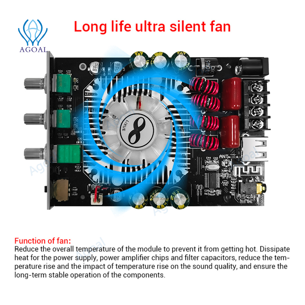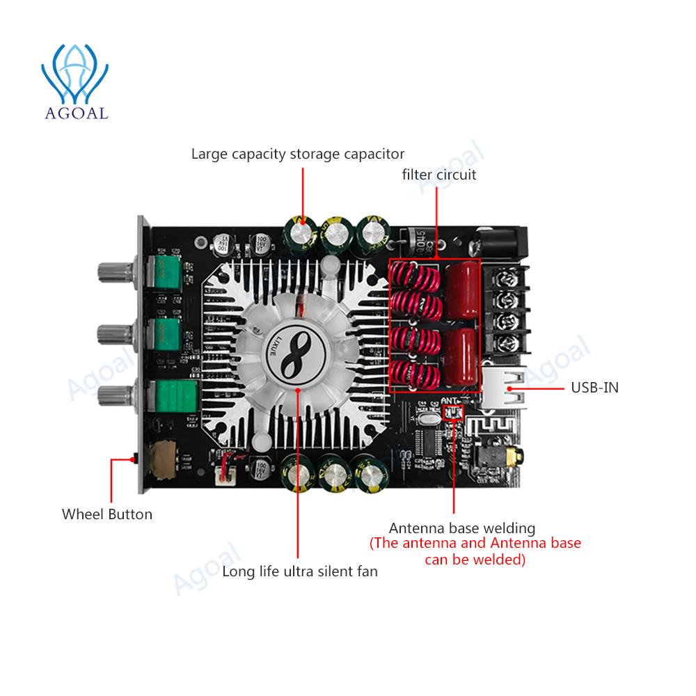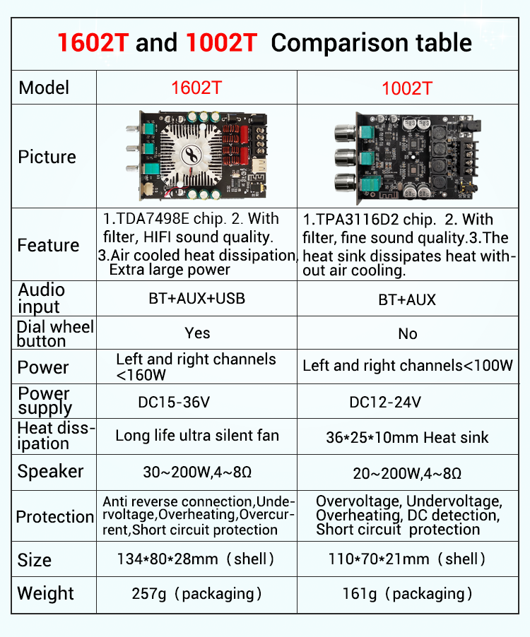 Чем выше напряжение источника питания, тем выше выходная мощность и чем меньше импеданс динамика, тем выше выходная мощность! Убедитесь, что мощность адаптера больше фактической рабочей мощности усилителя!