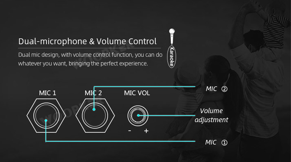 ● Энтрада де Micrófono двойной, reverberación регулируемый. Bluetooth incorpado Y Radio FM.