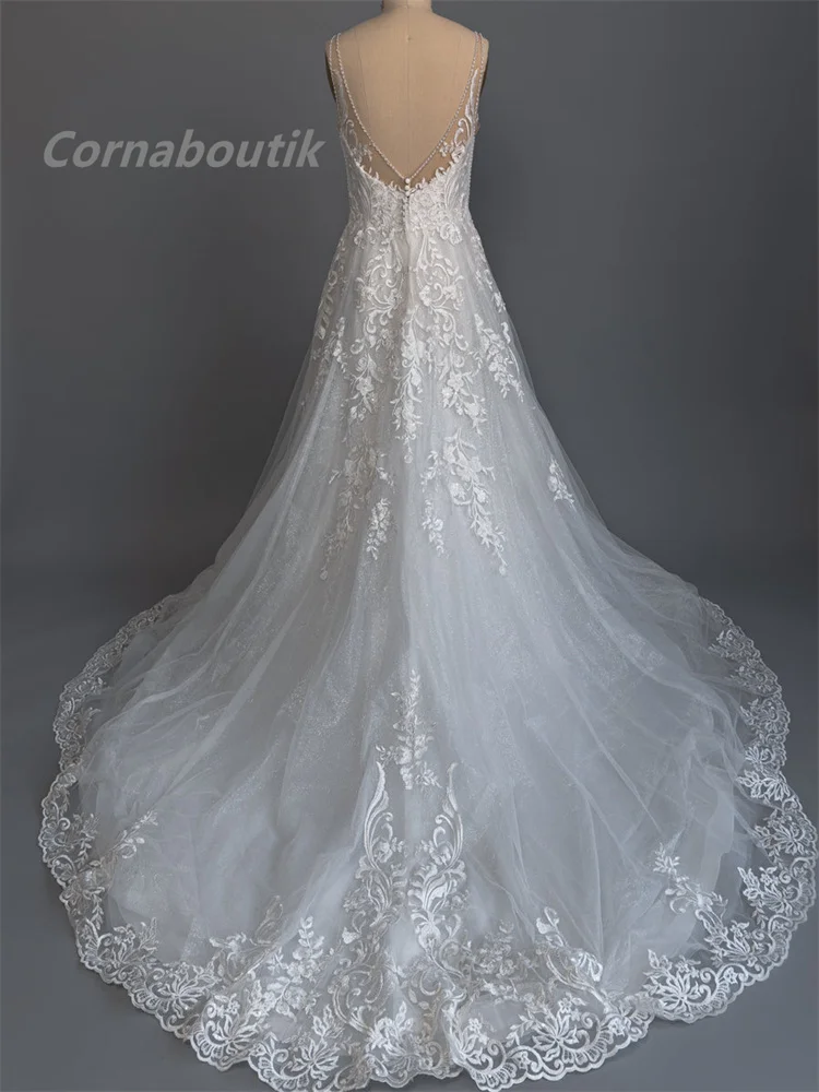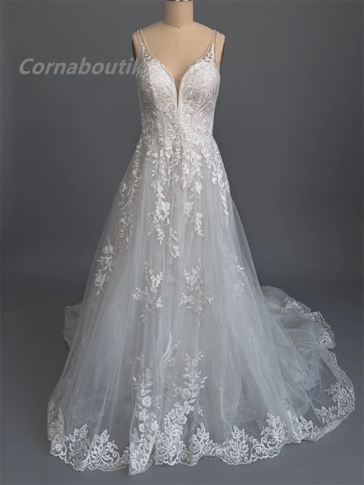 Платье Свадебное ТРАПЕЦИЕВИДНОЕ с цветочным кружевом, Кружевная аппликация на бретельках, платье невесты с глубоким декольте, боковые панели, отделка бусинами