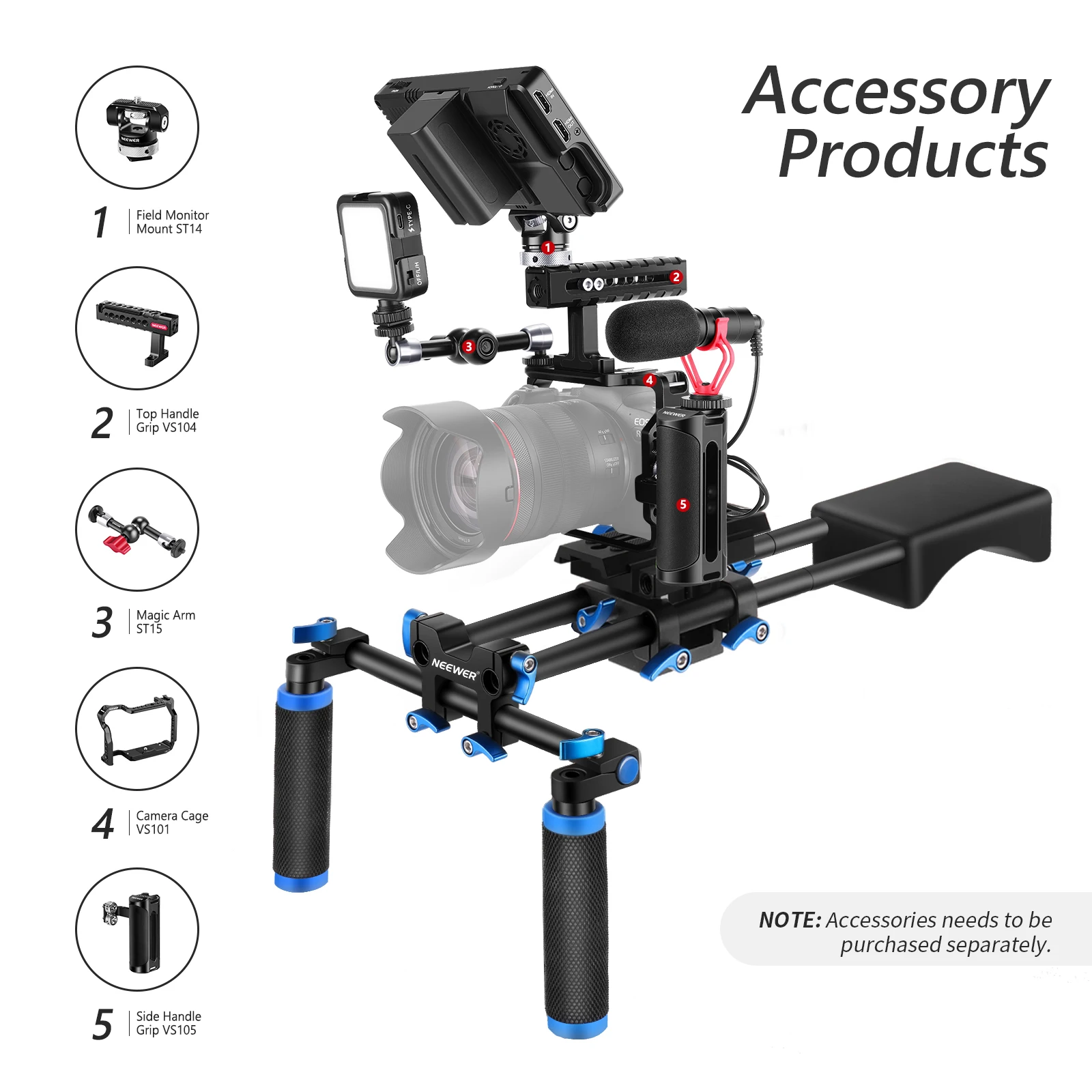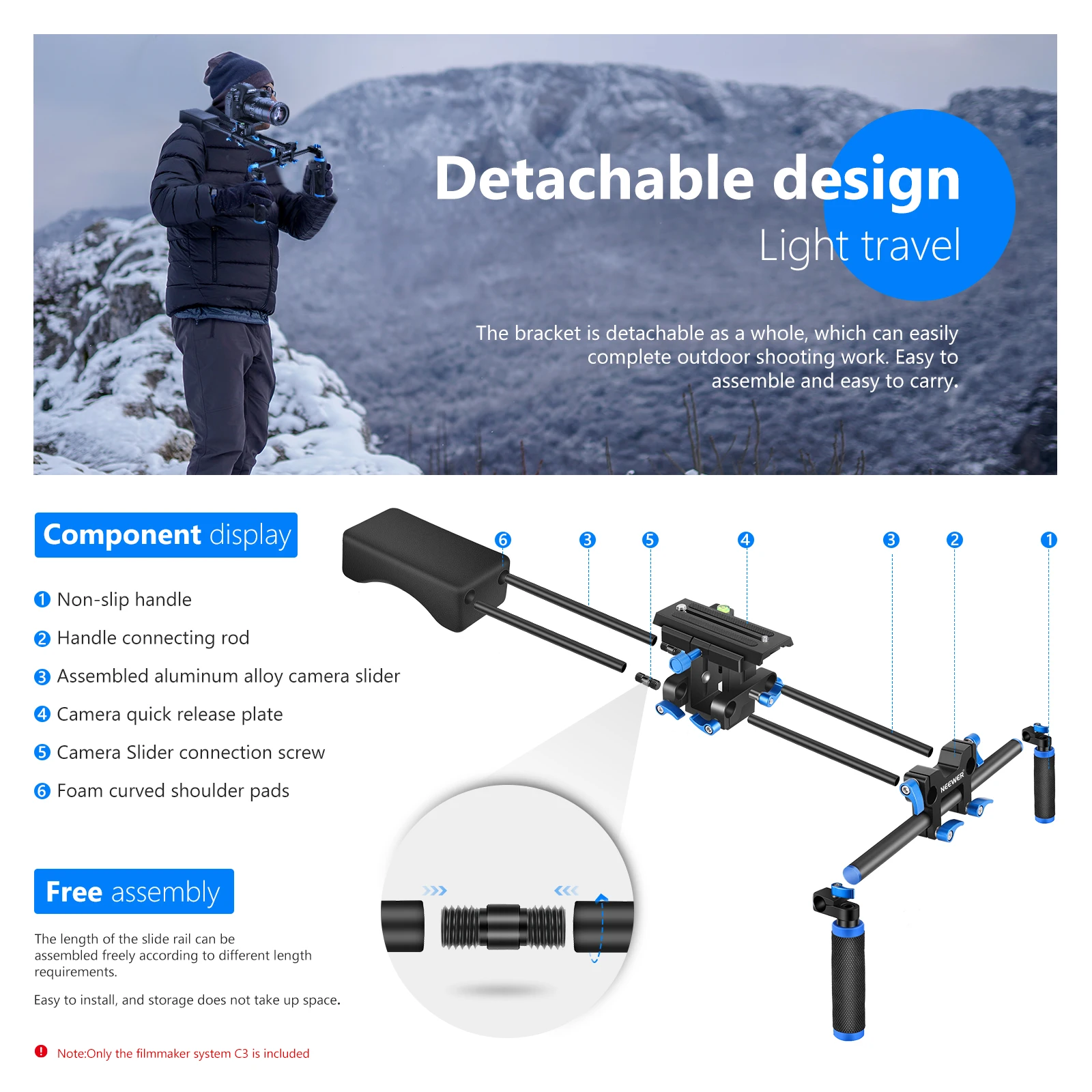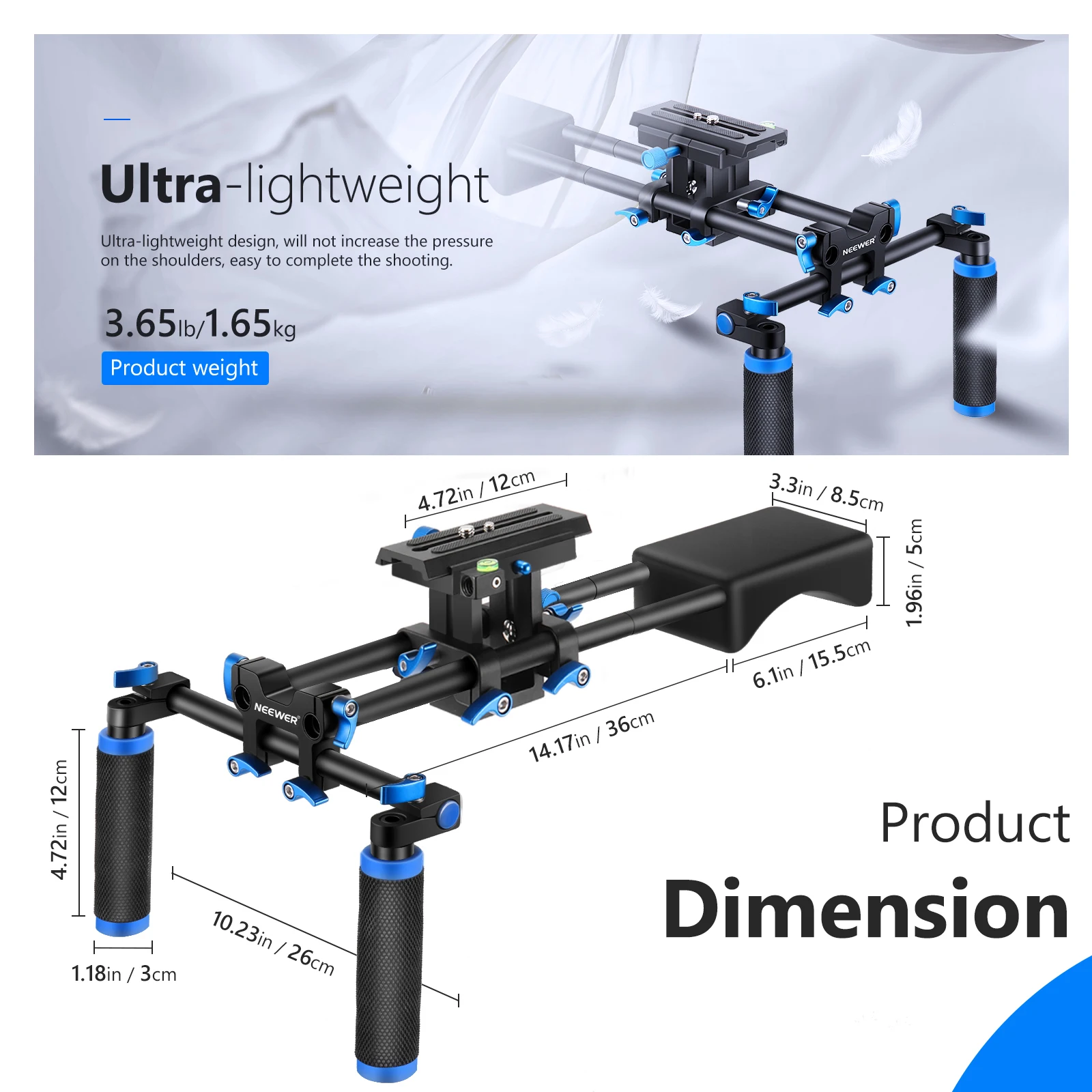 【Комплектация】 Ползунок для крепления камеры Neewer, мягкая резиновая накладка на плечо, система направляющих 15 мм с двумя ручками