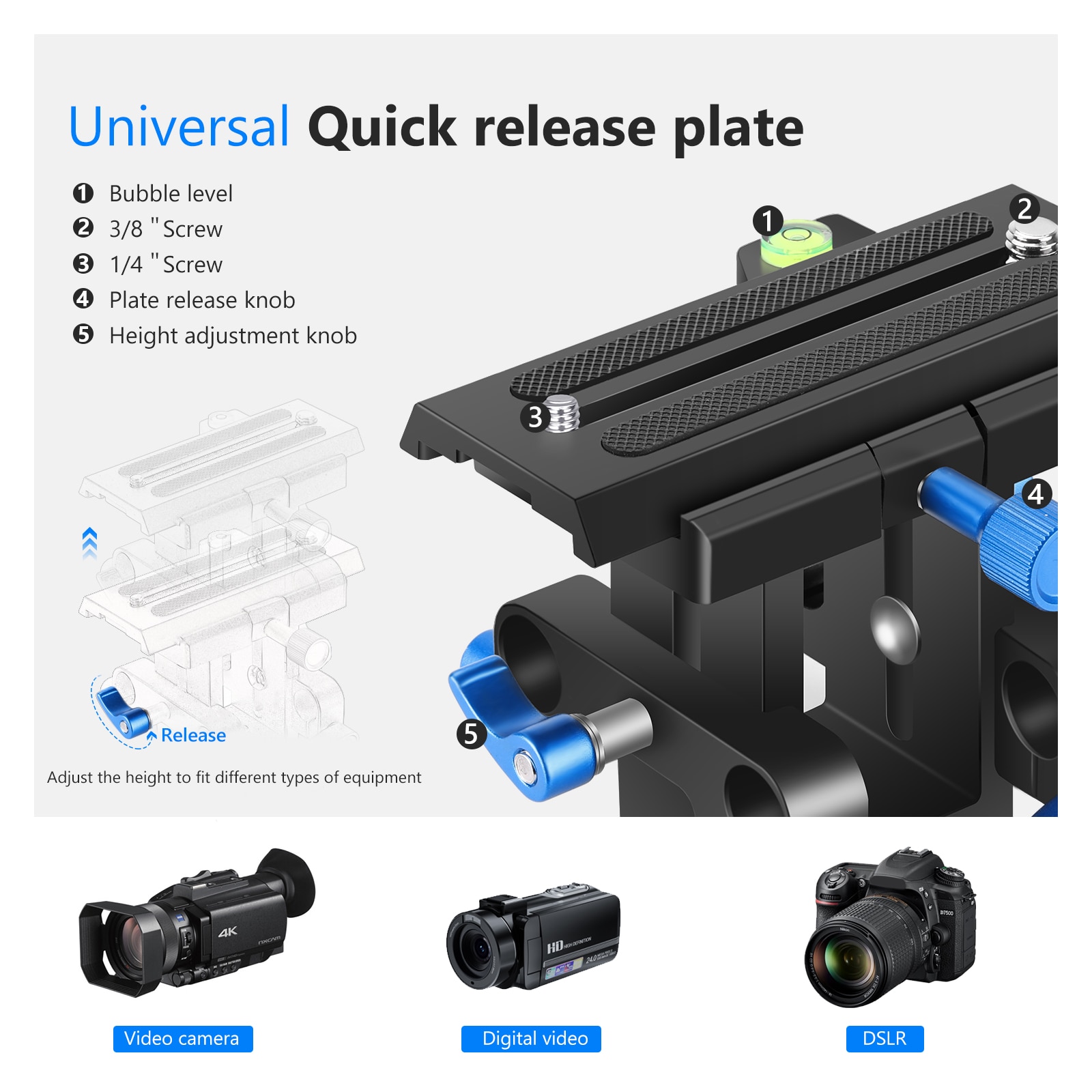 Легко Отрегулируйте высоту быстросъемной пластины и сдвиньте пластину на направляющих стержнях для масштабирования видео без регулировки объектива.