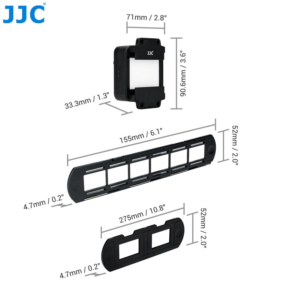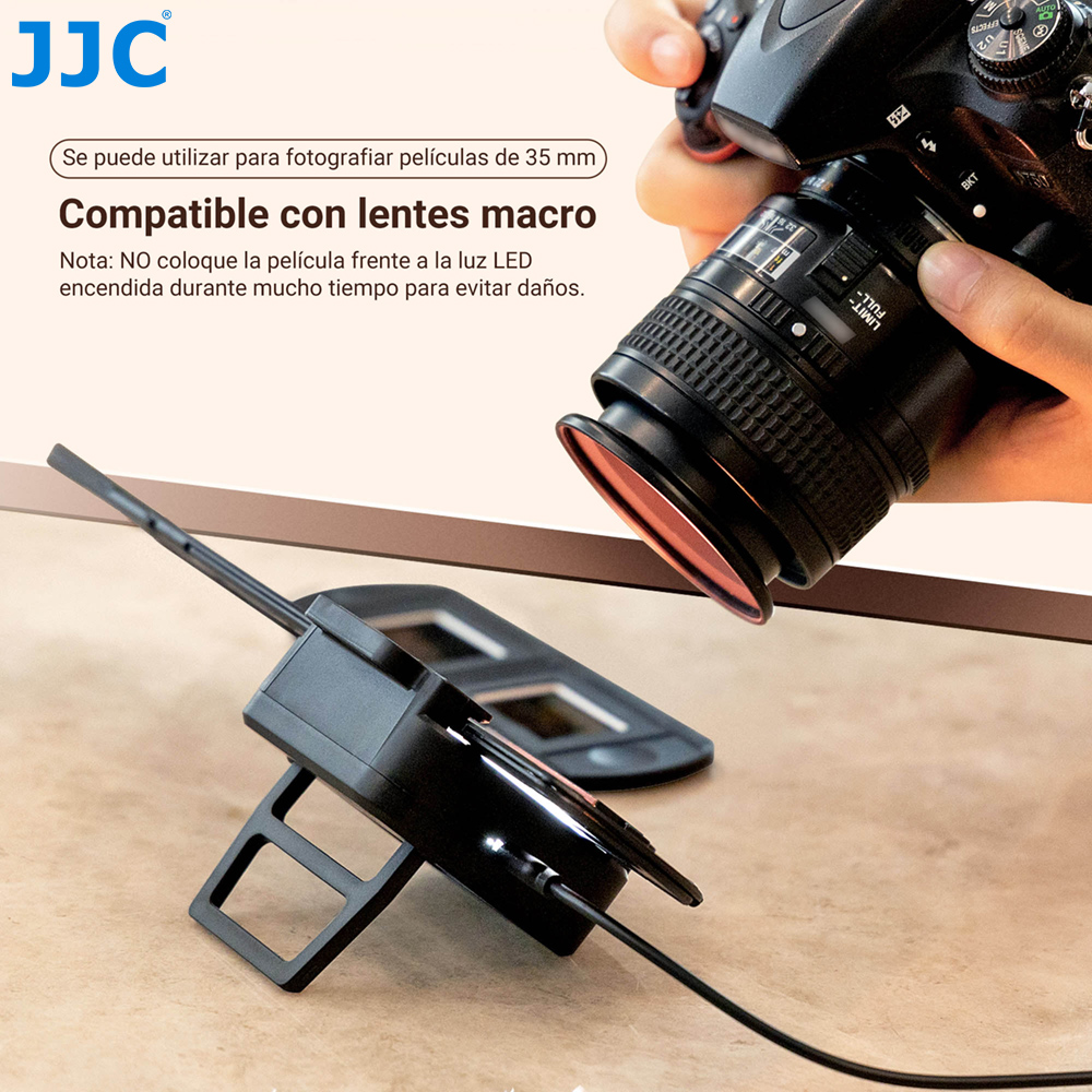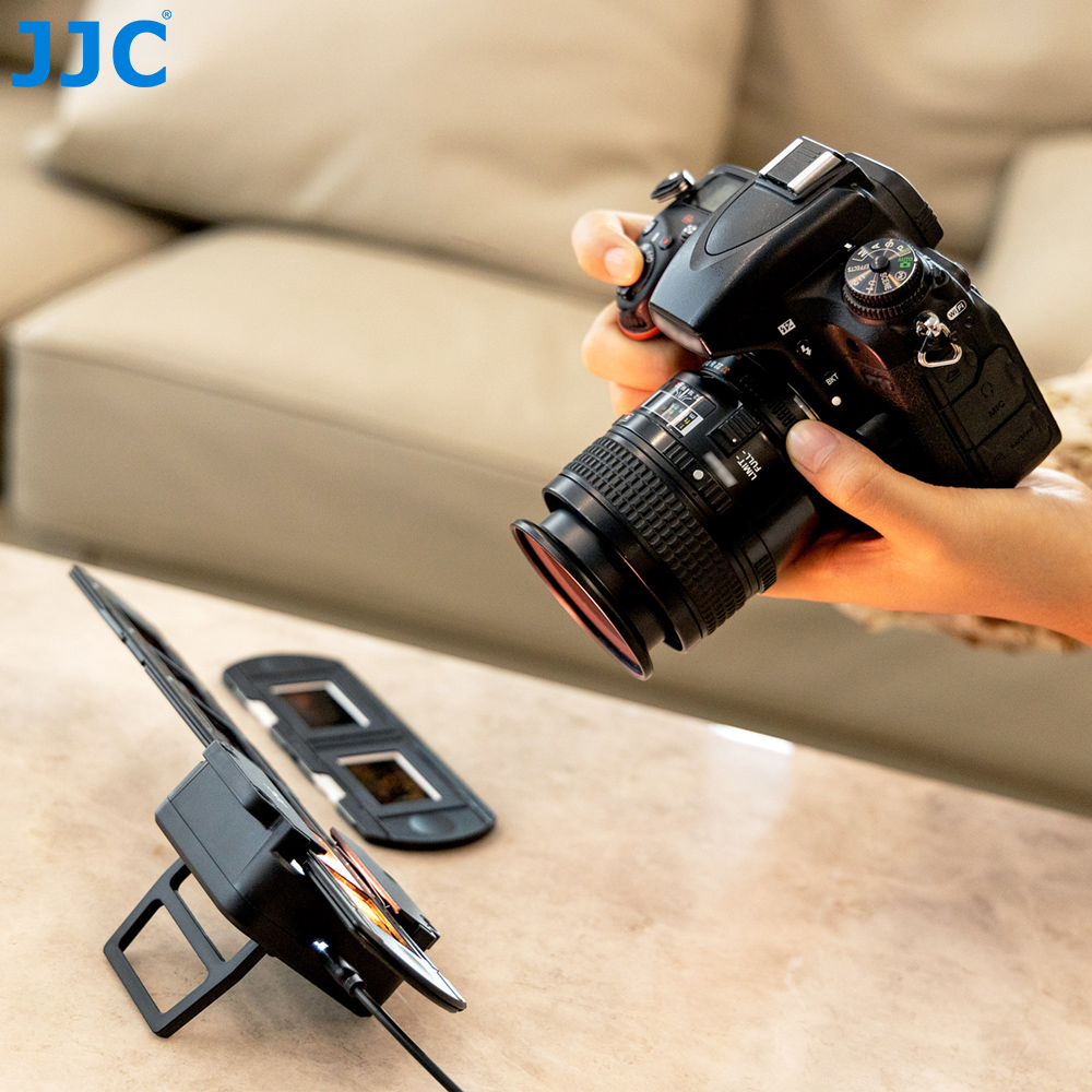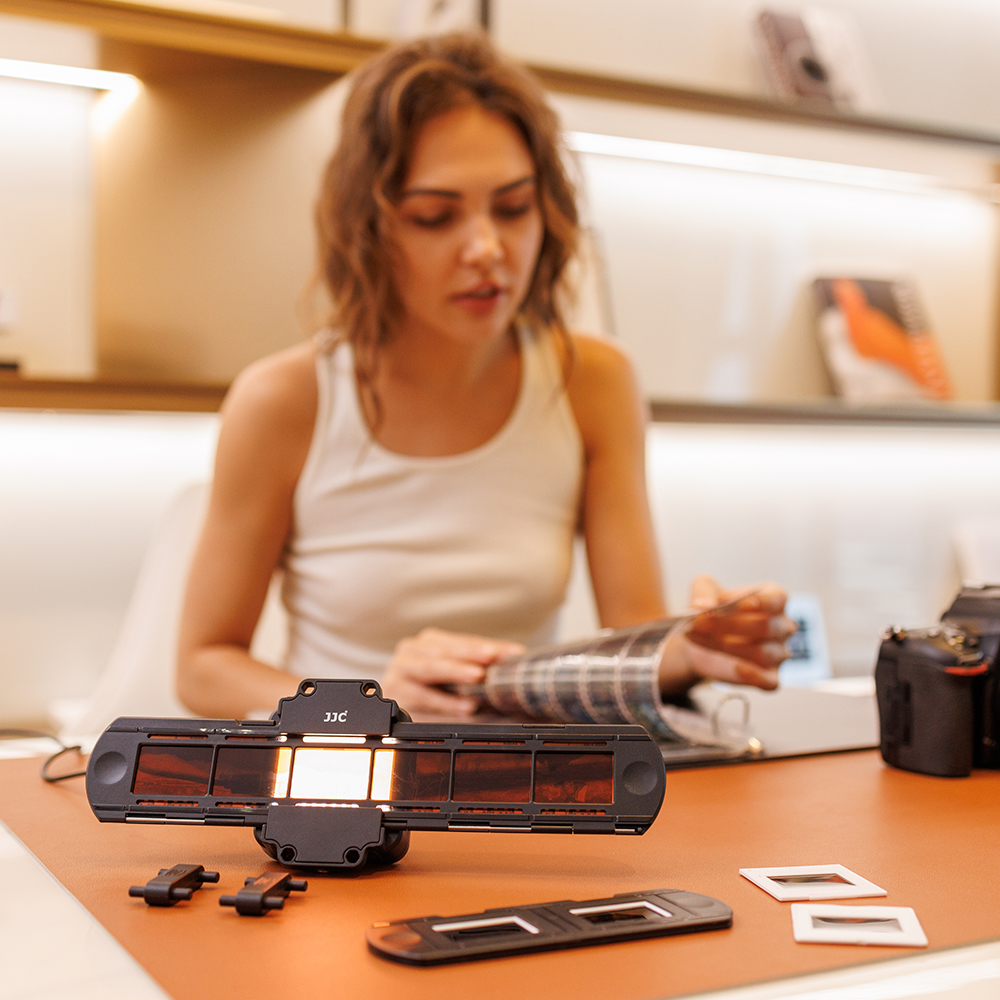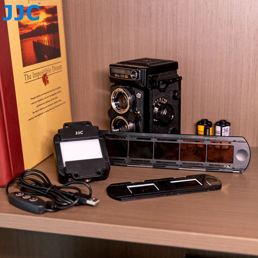 Набор светодиодных светильников JJC FDA-LED1 включает в себя светодиодную подсветку, держатель для скользящего крепления и держатель для ленточной пленки, который специально разработан для копирования негативов и преобразования пленки в цифровые файлы. Набор можно использовать для фотографирования 35-миллиметровой пленки.
