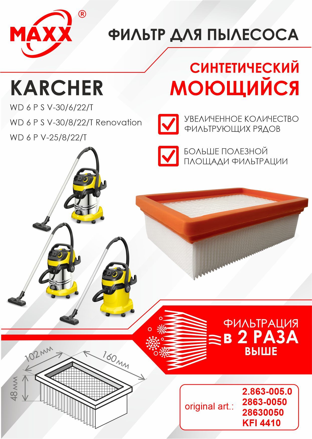 Плоский складчатый фильтр PRO синтетический, моющийся для пылесоса Karcher WD 6 P S V-30/6/22/T, Karcher WD 6 P S V-30/8/22/T , Karcher WD 6 P V-25/8/22/T (KFI 4410)