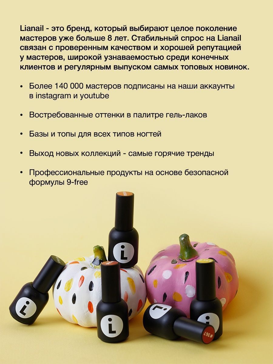 Описание: Гель лак LiANAiL - прекрасная возможность создать красивый, яркий и сочный цвет с первого слоя! Благодаря комплексу микронизированных цветовых пигментов и мельчайшим подвижным частицам в составе гель лака цвет наносится легко и плотно, визуально не утяжеляя ноготь. LiANAiL - первый нейл-бренд в стиле минимализм, продвигающий здоровье ногтевой пластины и индивидуальность в создании маникюра. Гель лак высоко пигментированный, не полосит и имеет средне-густую консистенцию, что позволяет аккуратно и ровно наносить его на ногтевую пластину. Гель хорошо распределяется по ногтю и самовыравнивается без затеканий под кутикулу. Обилие цветов позволит вам создать любой дизайн! Насыщенный бордовый, роскошный винный, красный, фиолетовый, бежевый, розовый, серый, желтый , зеленый,голубой, черный и белый - все эти оттенки помогут вам выполнить задумку клиента и воплотить мечту в жизнь. Темные осенние цвета, нежные весенние или яркие летние - дизайн любой сложности будет вам по плечу. Гель лак идет в удобном флаконе на 10 мл с эргономичным колпачком. Перед использованием необходимо обезжирить ноготь и нанести праймер. После двух слоев базы можно наносить гель лак, а в качестве финишного покрытия используйте топ. Снимается гель лак размачиванием за 10 минут.