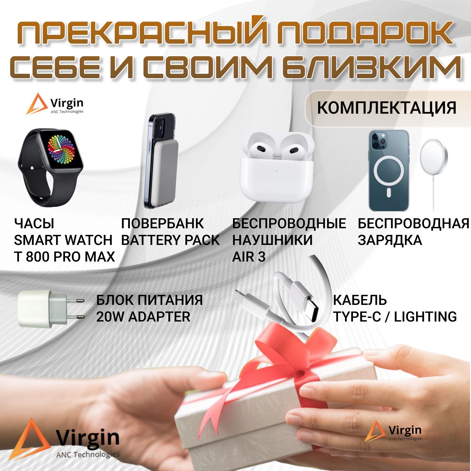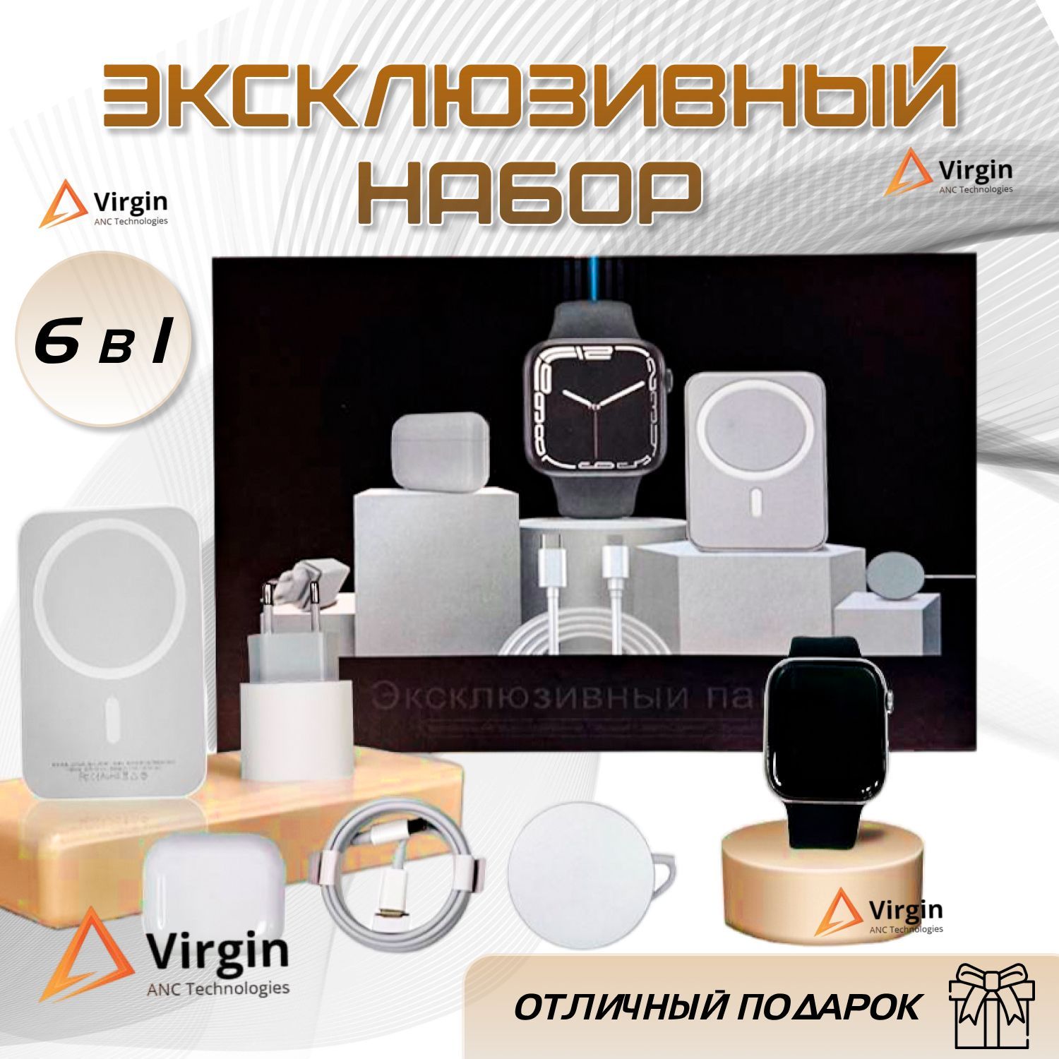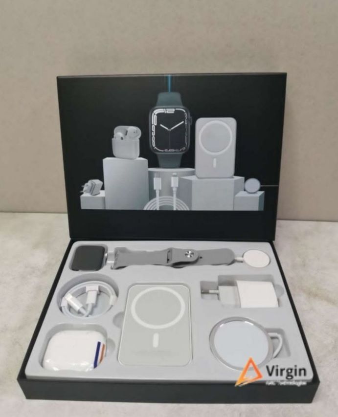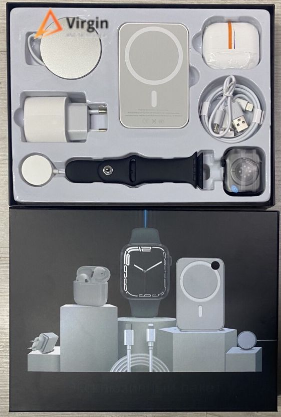 1. Смарт часы 8 серии - 1 шт 2. Беспроводные наушники Air 3 - 1 шт 3. Battery pack с анимацией - 1 шт 4. Беспроводная зарядка - 1 шт 5. Блок быстрой зарядки - 1 шт 6. Провод lighting-type C - 1 шт