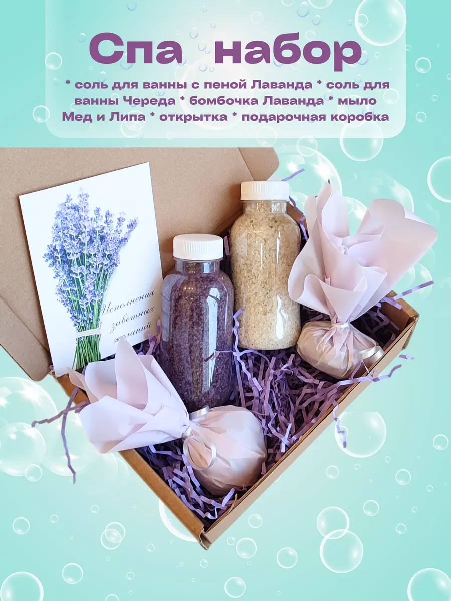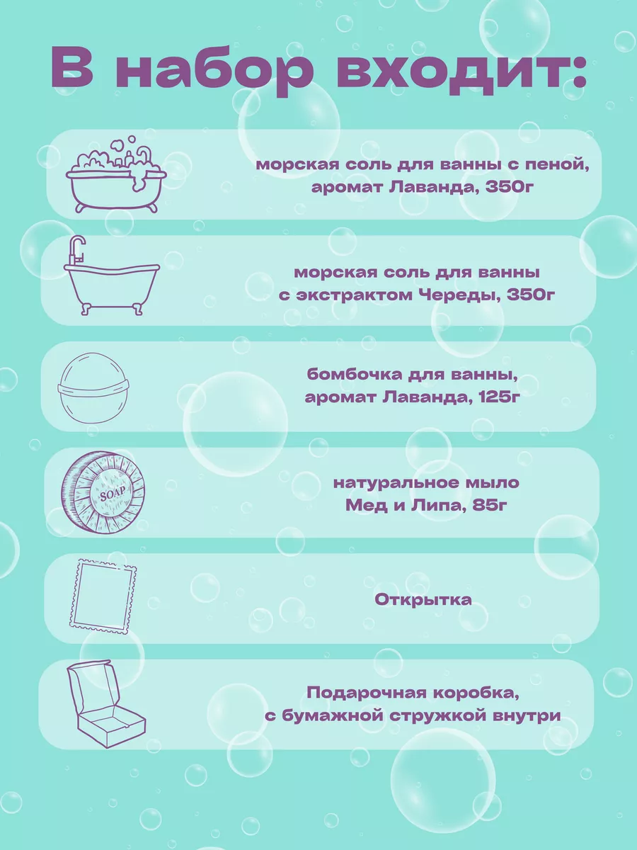 Комплектация Соль с пеной для ванны; Соль для ванны; Бомбочка для ванны; натуральное мыло; Открытка; Коробка с бумажной стружкой