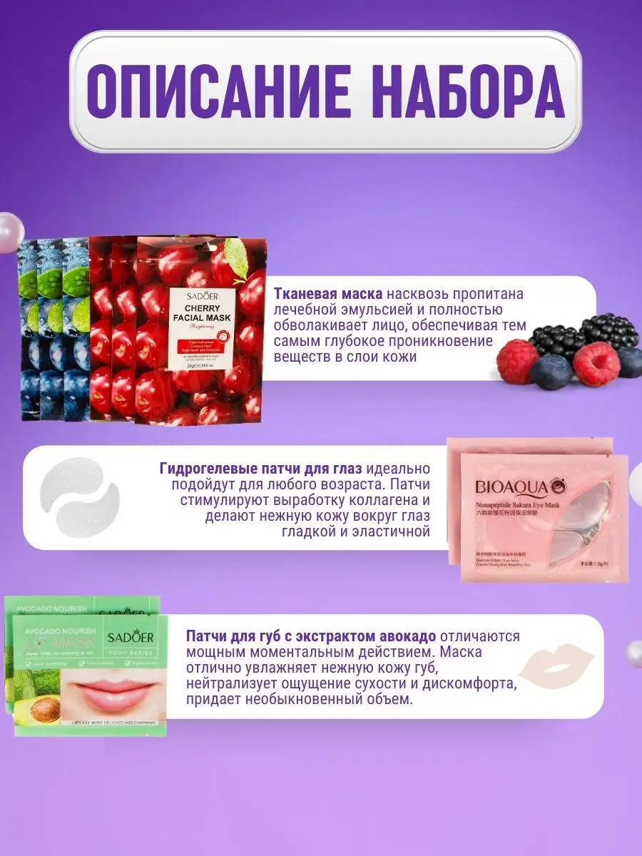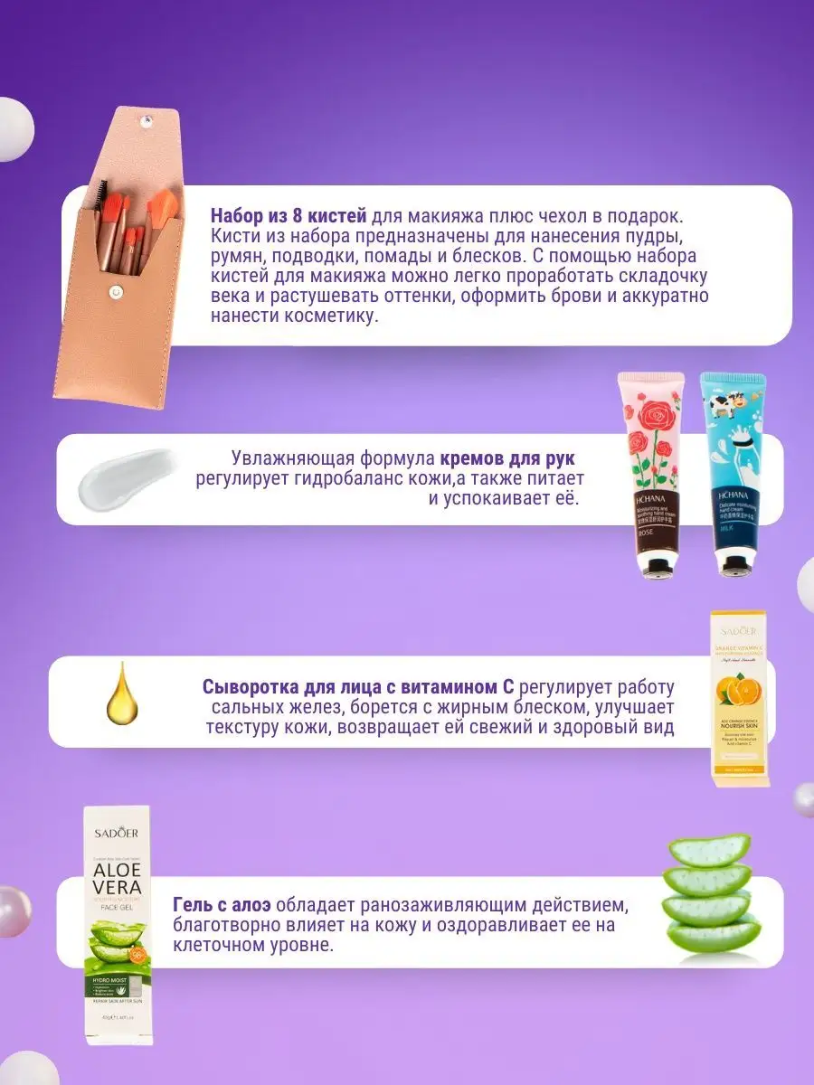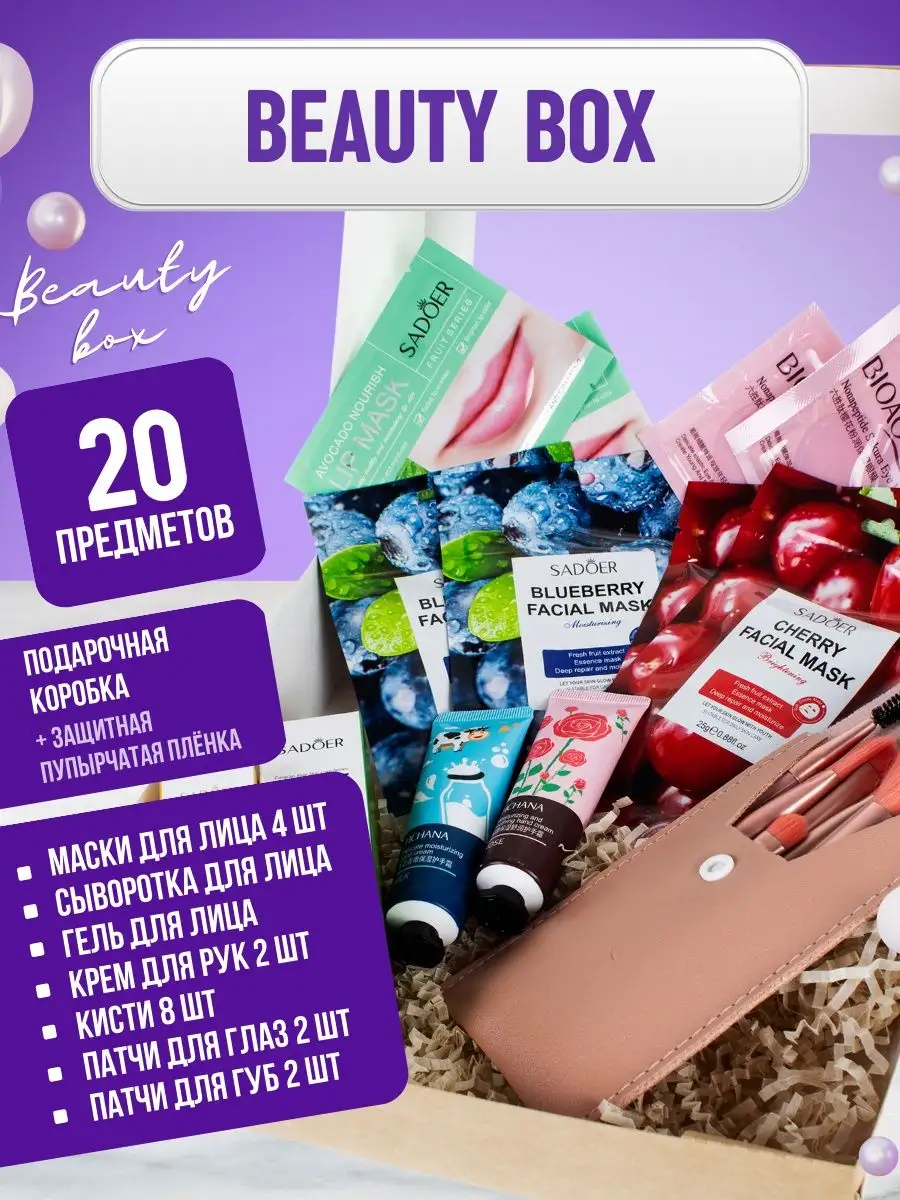 Артикул 59752170 Состав маска для лица; патчи для глаз; патчи для губ; набор кистей; Сыворотка для лица; крем для рук; гель с алое