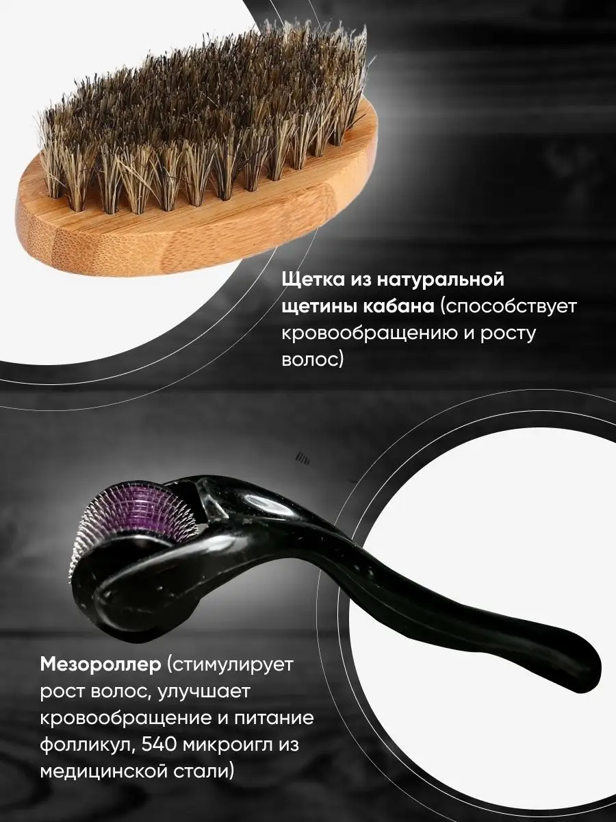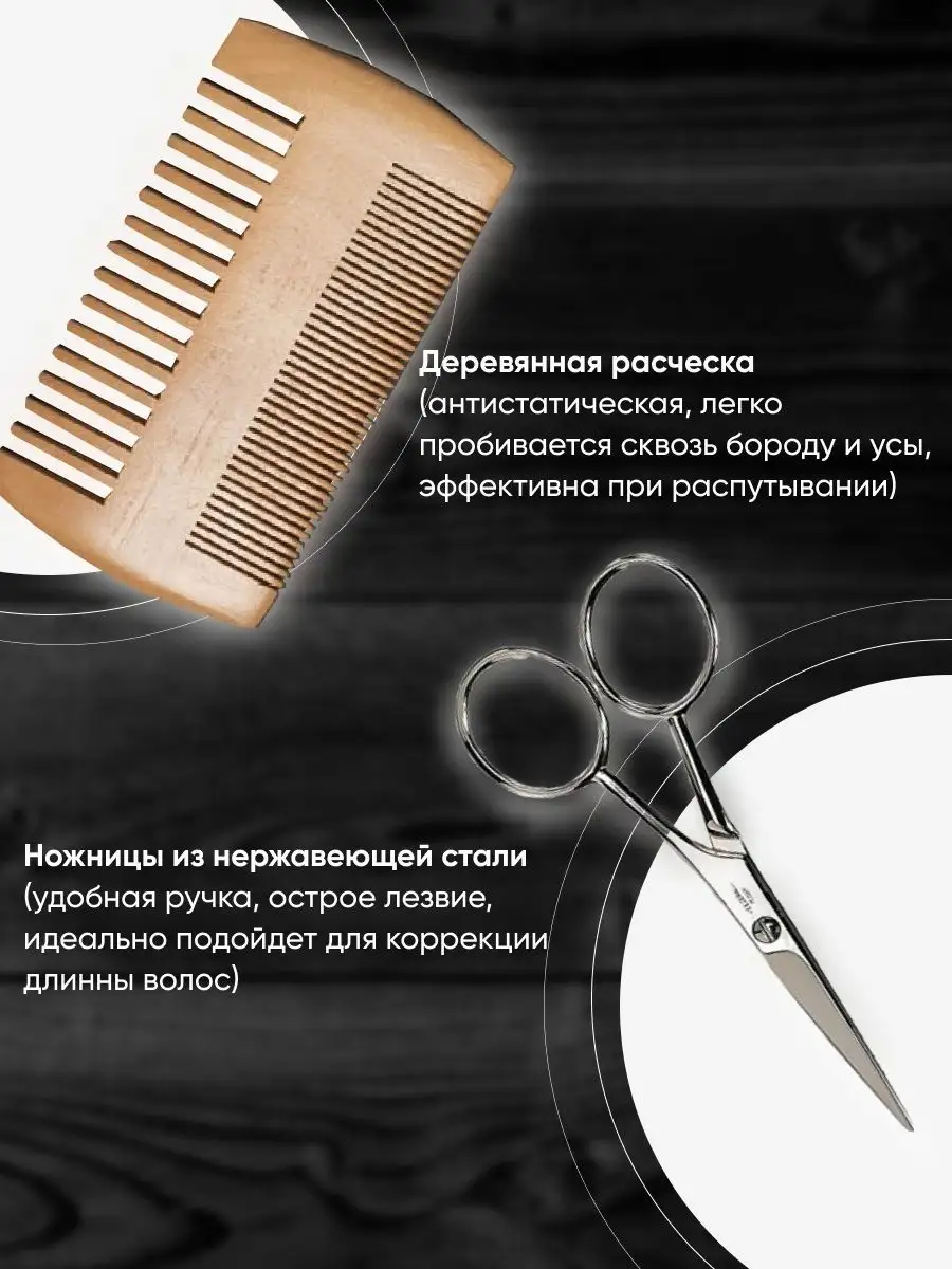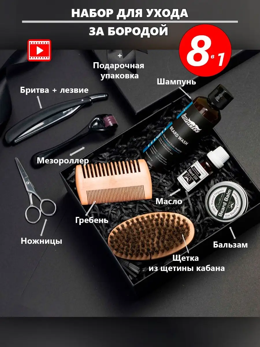 Комплектация Ножницы для бороды и усов - 1 шт; Массажер мезороллер; Опасная бритва со сменными лезвиями - 1 шт; Бальзам для бороды, масло для бороды, шампунь для бороды; Щетка и расческа гребень для бороды
