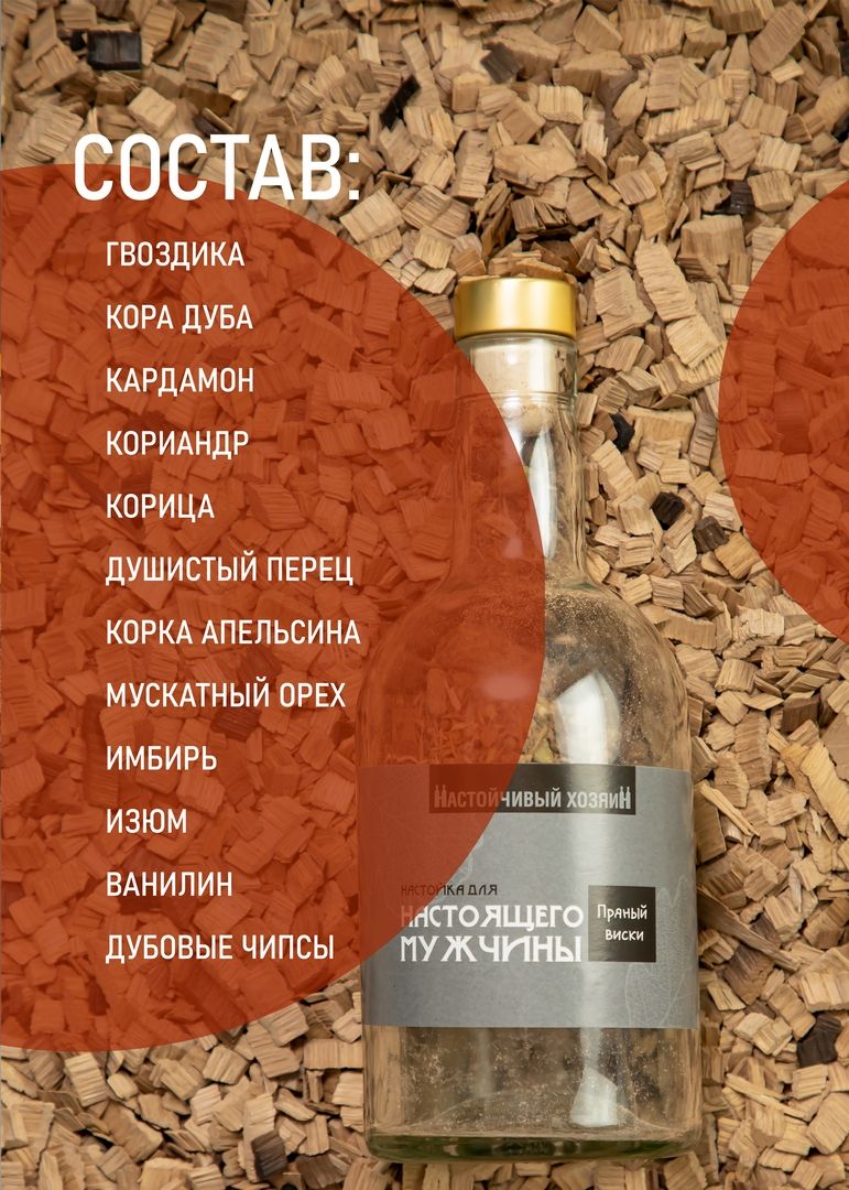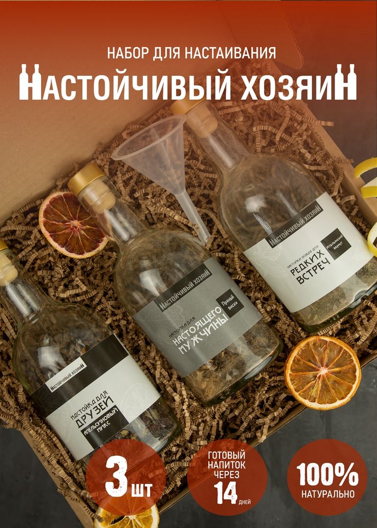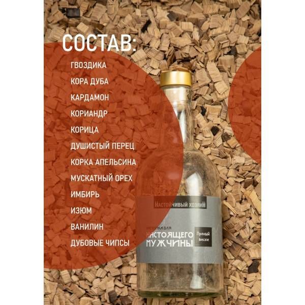Описание: Подарочный набор для настоек "Настойчивый хозяин" 3 бутылкиНастойки для самогона НАСТОЙЧИВЫЙ ХОЗЯИН - это натуральный травяной сбор из четырех настоек. Идеальный мужской подарочный набор для приготовления настоек.Пряный вискиЭто классический виски с дубовым ароматом, богатый вкус изюма, мускатного ореха и легкие нотки ванили. В послевкусии ощущается пряность корицы, имбиря и легкий цитрусовый фон.