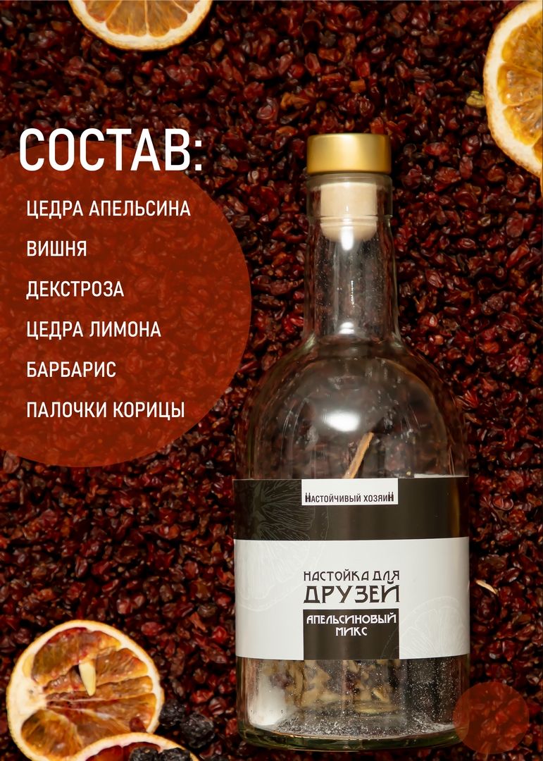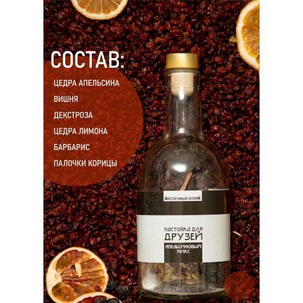 • Натуральные ингредиентыКаждый из них был бережно собран, обработан и приведен в необходимый для настаивания вид. Никаких красителей, регуляторов и прочей химии, только то, что и должно быть в домашнем качественном продукте.