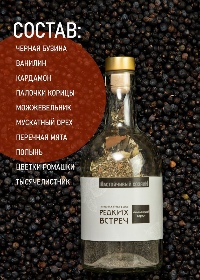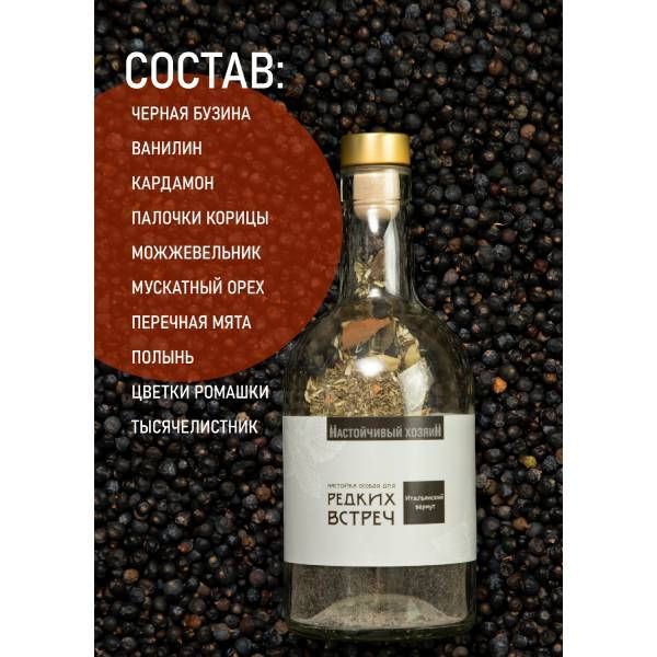 Состав: черная бузина, кардамон, можжевельник, перечная мята, цветки ромашки, ванилин, палочки корицы, мускатный орех, полынь, тысячелетник.