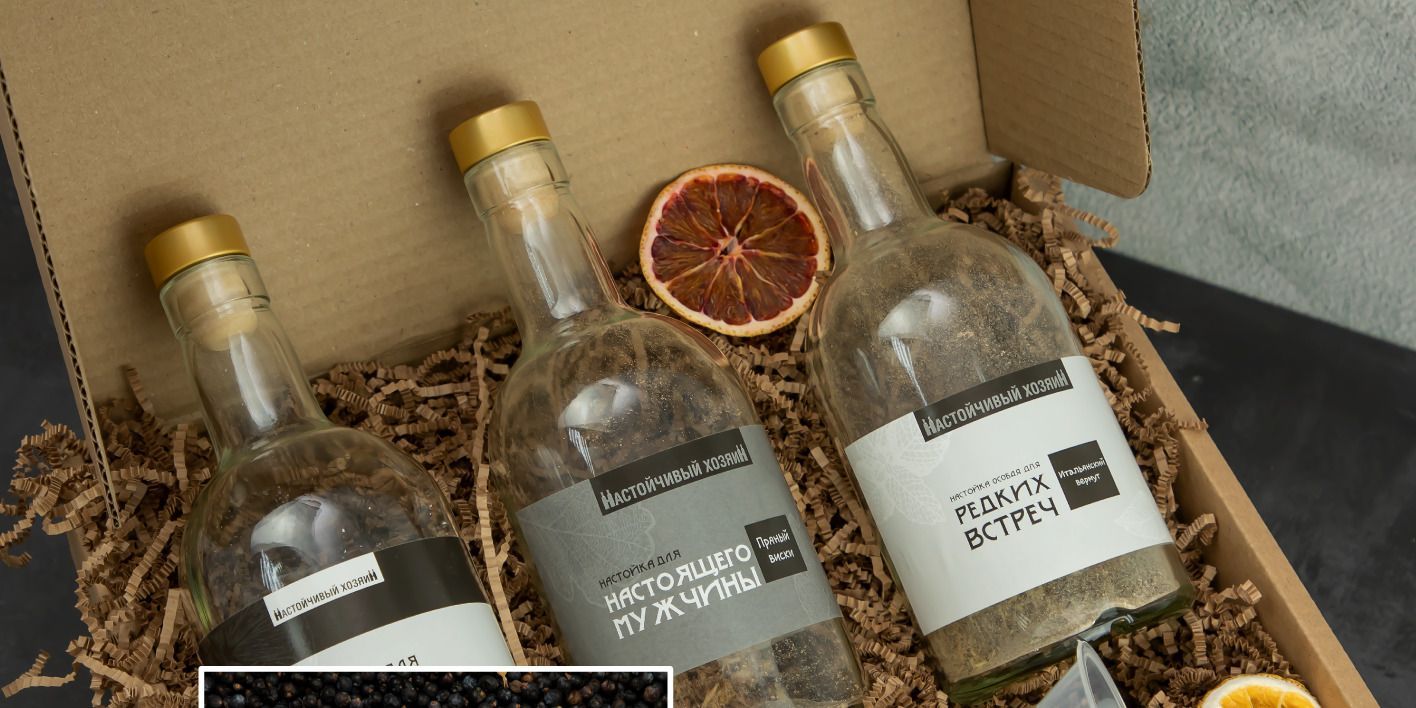 • Удобство настаиванияКаждый набор приезжает с уже готовой тарой для хранения – стеклянной бутылке объемом 0.5 л. К каждому из наборов кладется небольшая воронка, чтобы было удобно наливать самогон. Прозрачная бутылка позволит и оценить натуральность ингредиентов, и наблюдать за процессом настаивания. Этикетка на бутылках позволит не перепутать настойки между собой.