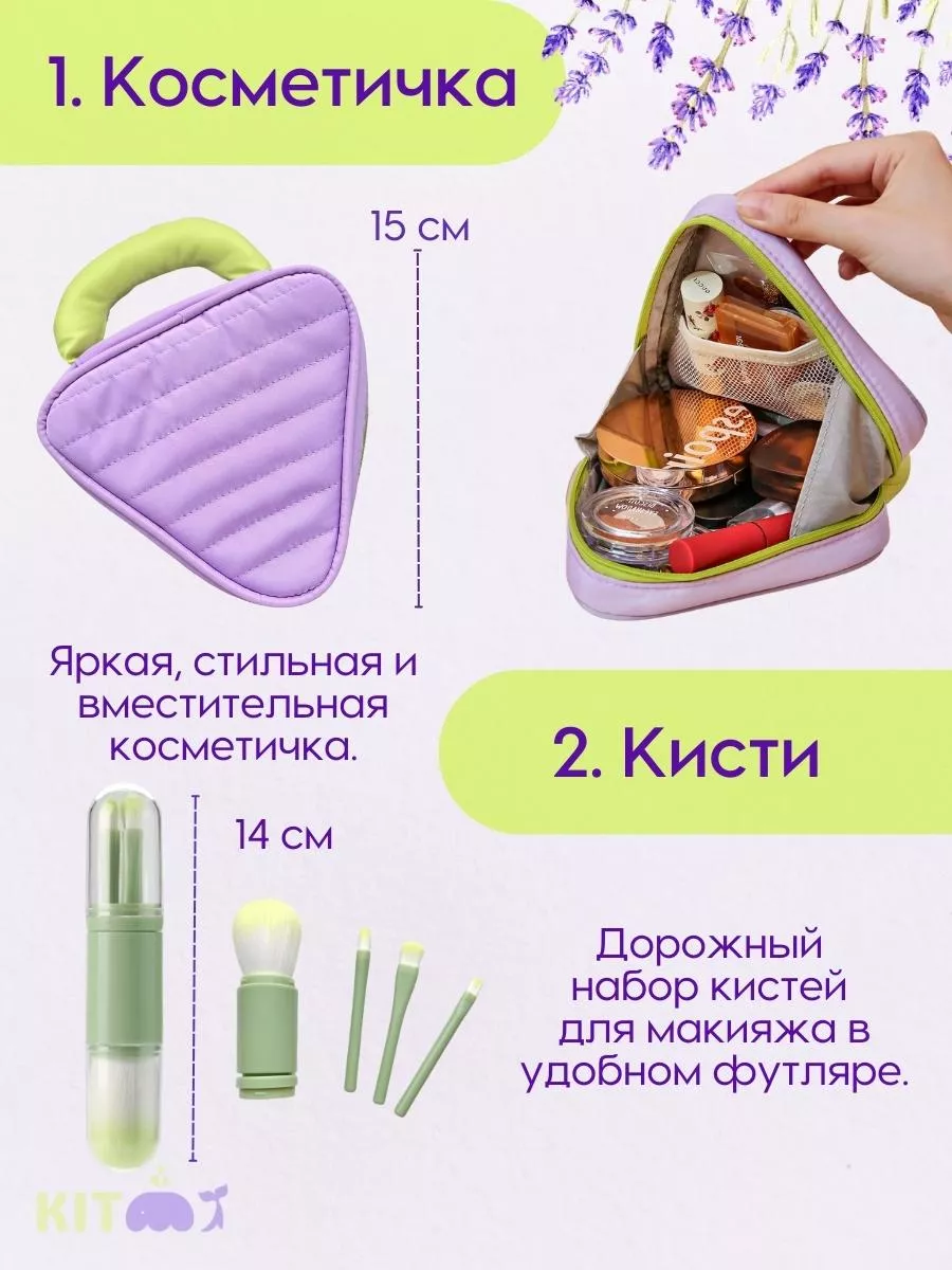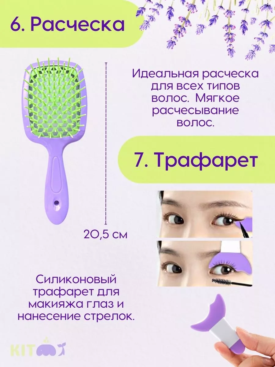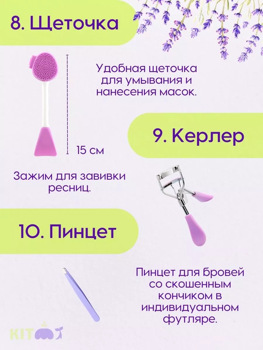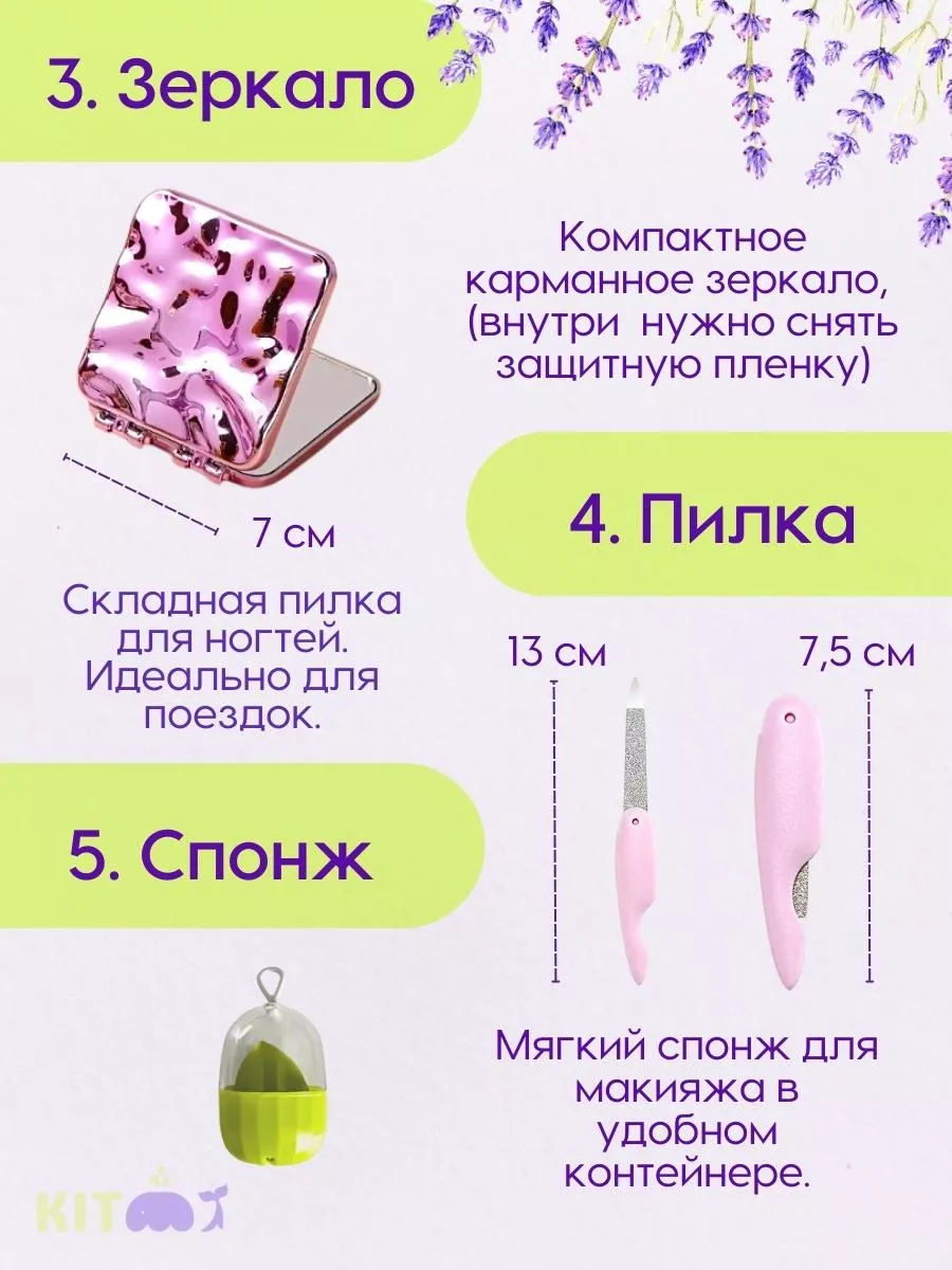Комплектация пинцет для бровей и щипцы для ресниц; кисти и спонж для макияжа; расческа и резинки для волос; косметичка пилка для ногтей; зеркало