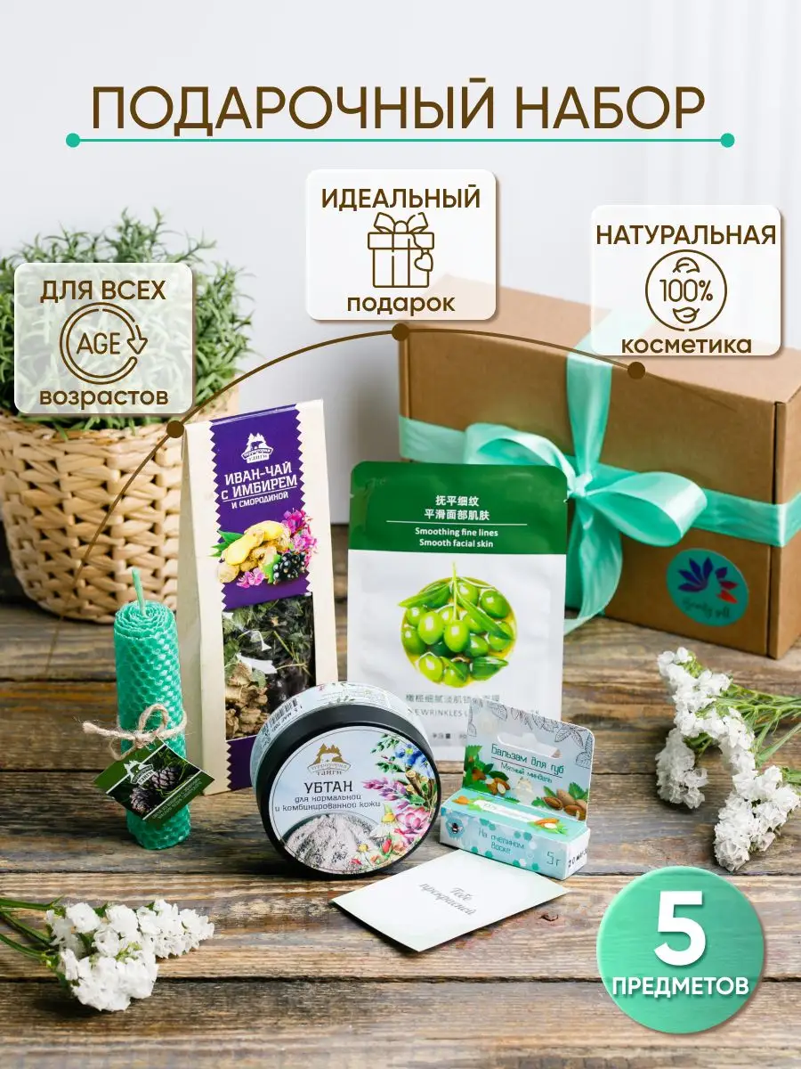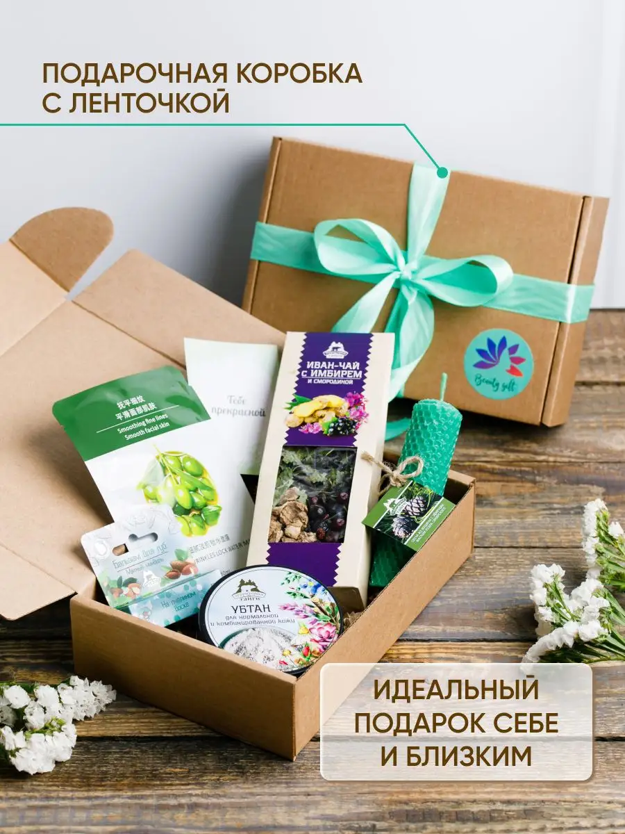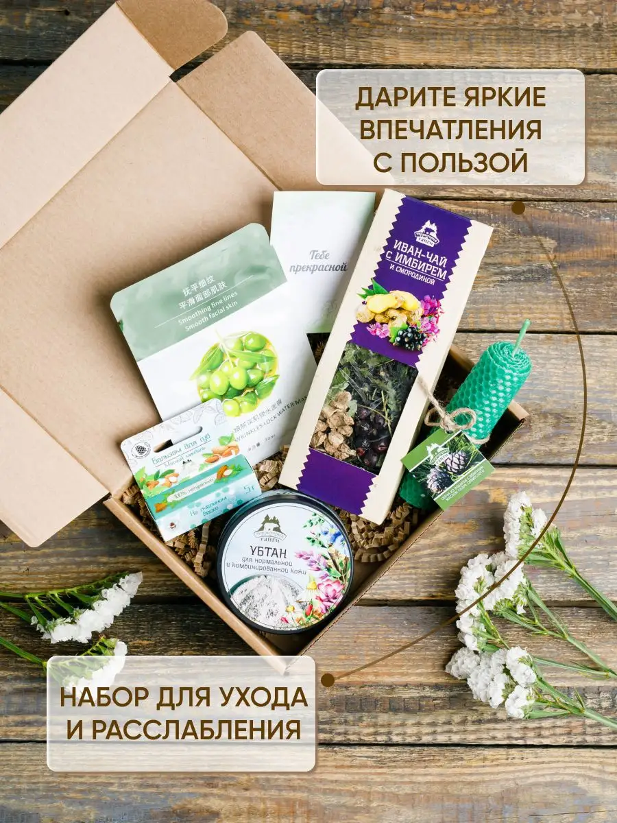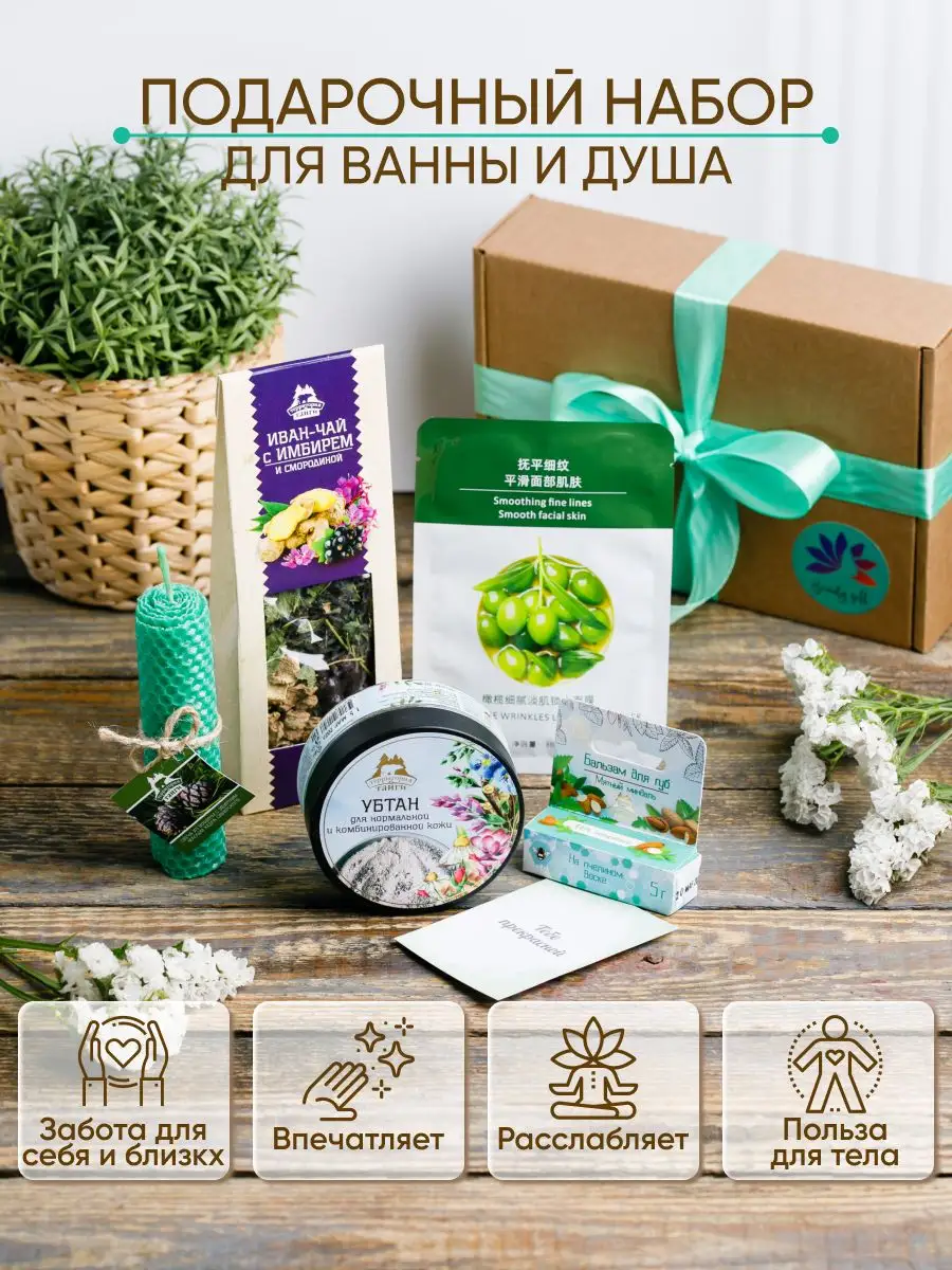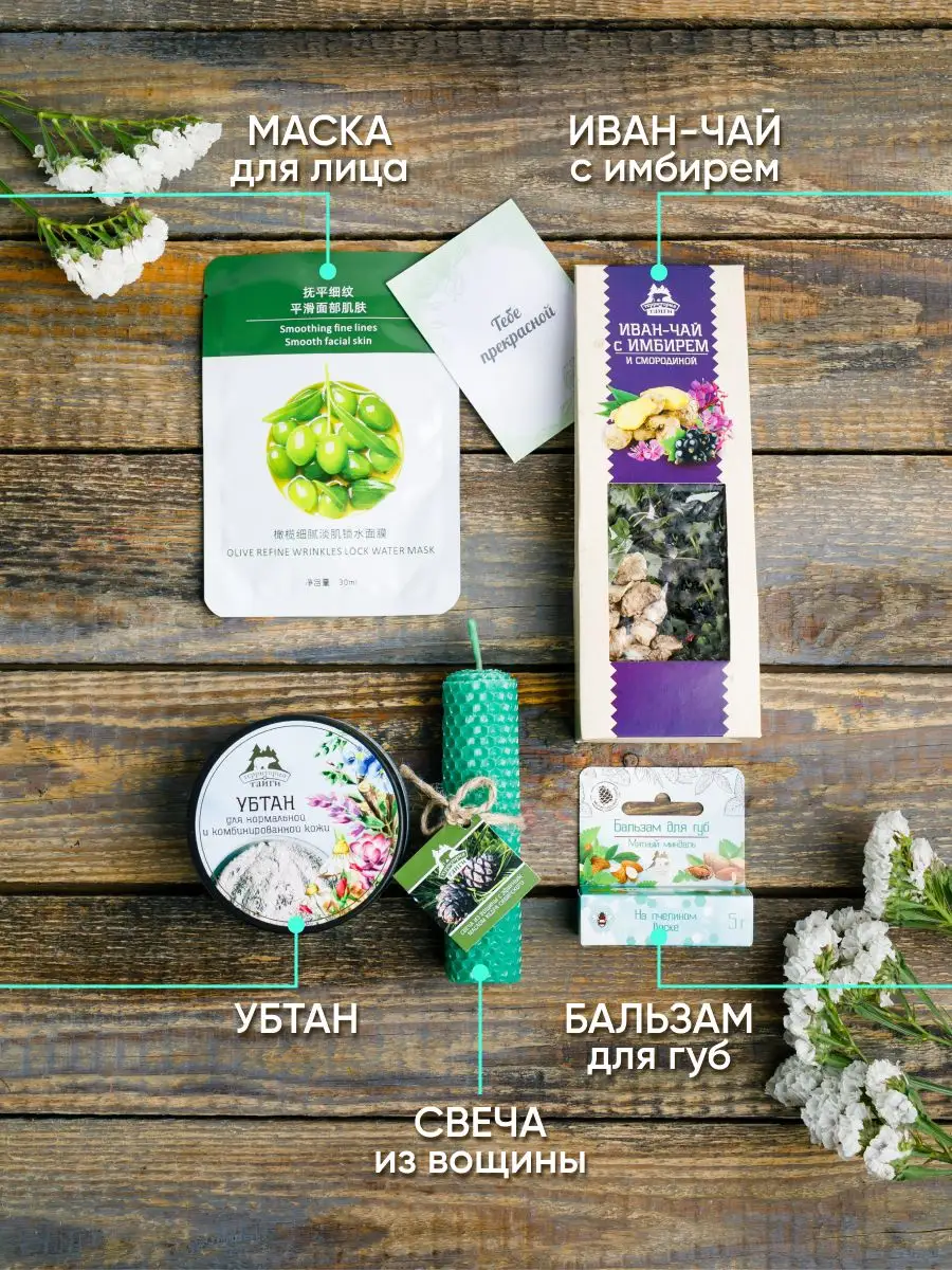 Комплектация убтан - 1шт; Бальзам для губ - 1шт; Маска для лица - 1шт; Ароматическая свеча - 1шт; иван-чай с имбирем и смородиной - 1шт